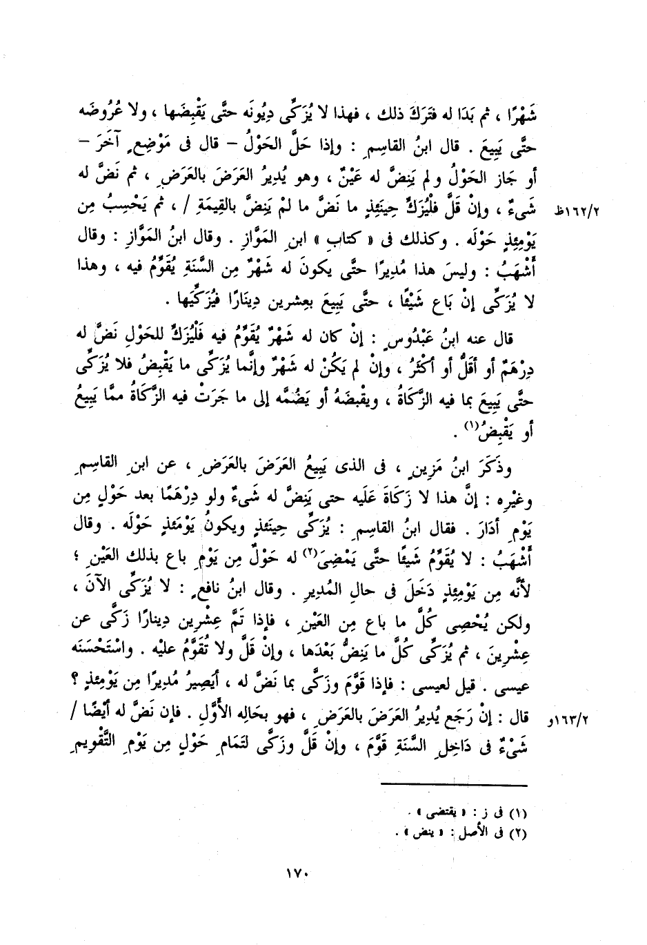 قال عنه ابن عبدوسٍ: إنْ كان له شهرٌ يُقوِّمُ فيه فليُزكِّ للحولِ نَضَّ له درهمٌ أو أقلُّ أو أكثرُ، وإنْ لم يكن له شهرٌ وإنَّمَا يُزكِّي ما يقبضُ فلا يزكِّي حتى يبيع بما فيه الزكاة، ويقبضه أو يضمَّه إلى ما جرتْ فيه الزكاة ممَّا يبيعُ أو يقبض.