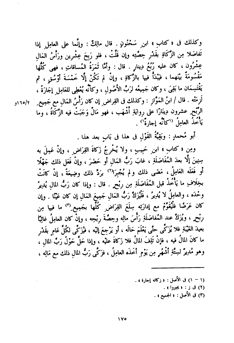 وكذلك في "كتاب" ابن سحنونٍ. قال مالكٌ: وإنَّما على العاملِ إذا تفاصلا من الزكاةِ بقدرِ حصته وإن قلَّتْ. فلو ربح عشرين ورأس المال عشرون، كان عليه ربع دينارٍ، قال: وأمَّا ثمرة المساقاتِ، فهي كلها مقسومة بينهما، فيبدأ فيها بالزكاة، وإن لم تكن إلاَّ خمسة أوسقٍ، ثم يقتسمان ما بقي، وكان جميعه لربِّ الأصولِ، وكأنَّه يُعطي للعاملِ إجارةً، لزمته. قال ابن الْمَوَّاز: وكذلك في القراضِ إن كان رأس المالِ مع جميع الربح عشرون ديناراً على رواية أشهب، فهو مالٌ وجبت فيه الزكاةُ، وما يأخذ العامل كأنَّه إجارةٌ.