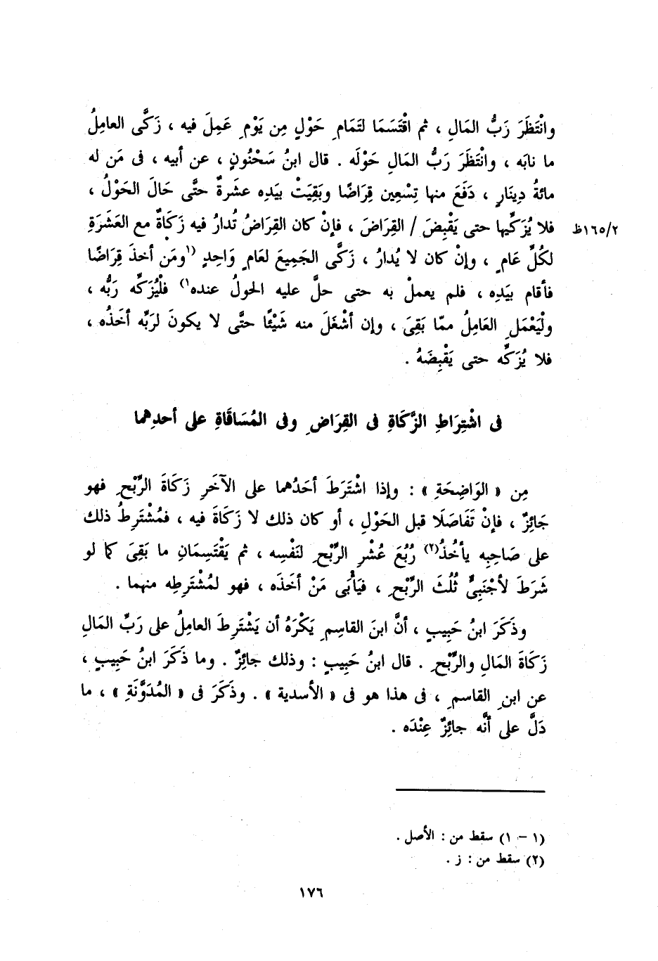 من "الواضحة": وإذا اشترط أحدهما على الآخر زكاة الربحِ فهو جائزٌ، فإن تفاضلا قبل الحولِ، أو كان ذلك لا زكاة فيه، فمشترطُ ذلك على صاحبه يأخذ ربع عشر الربح لنفسهِ، ثم يقتسمان ما بقيَ كما لو شرطَ لأجنبيٍّ ثلثَ الربحِ، فيأبَى مَن أخذه، فهو لمشترطه منهما.
