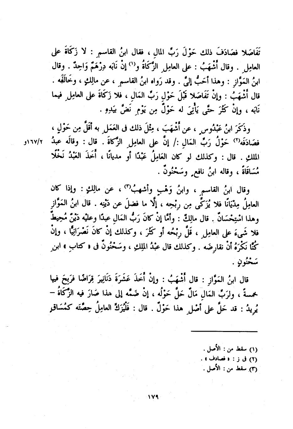 وذكر ابن عبدوسٍ، عن أشهبَ، مثل ذلك في العملِ به اقلَّ من حولٍ، فصادفه حولُ ربِّ المالِ: إنَّ على العامل الزكاة. قال: وقاله عبدُ الملكِ. قال: وكذلك لو كان العامل عبداً أو مدياناً، أخذَ العبدُ نخلاً مُساقاةً، وقاله ابنُ نافعٍ وسحنونٌ.