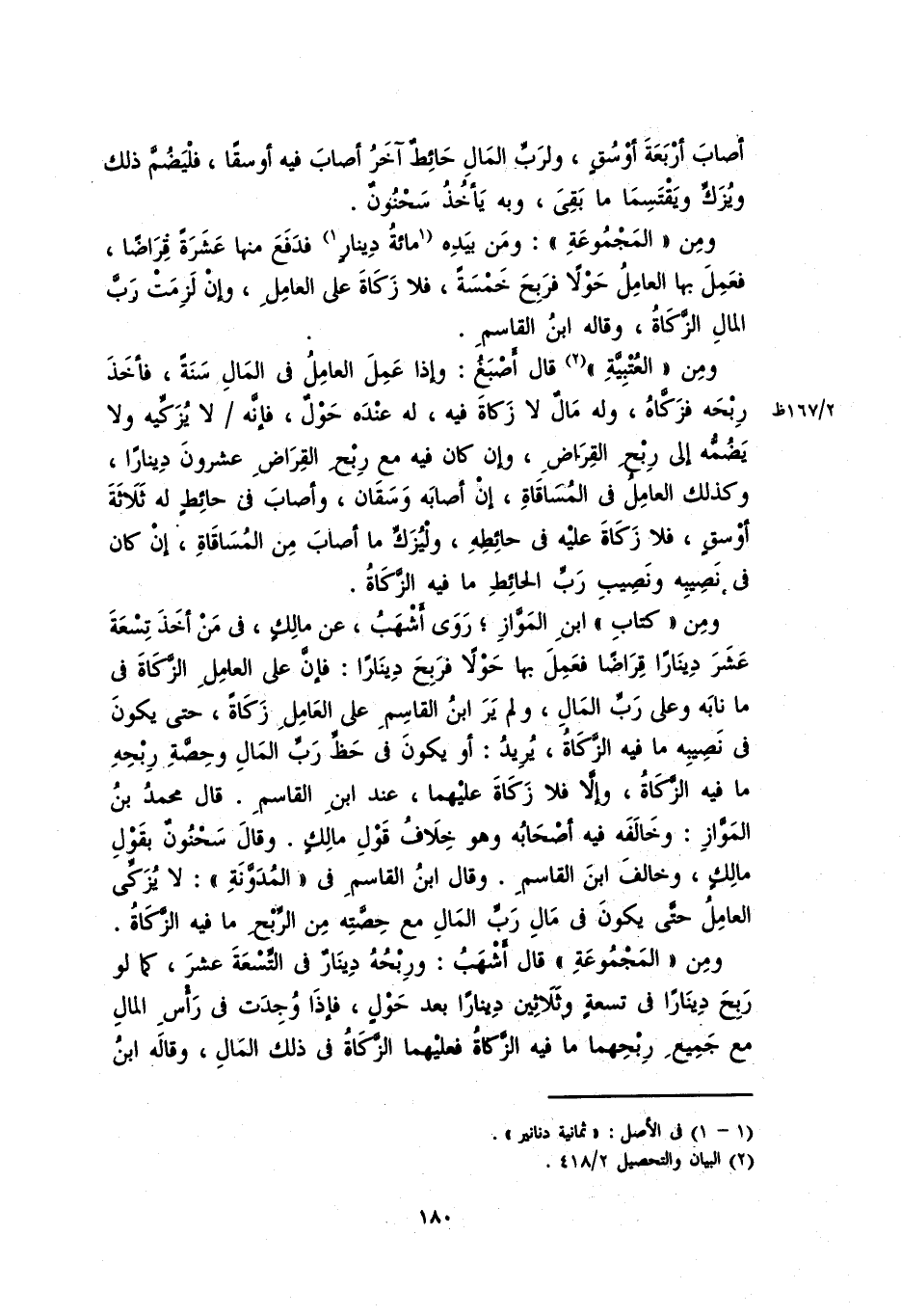 ومن "كتاب" ابن الْمَوَّاز، روى أشهبُ، عن مالكٍ، فِي مَنْ أخذ تسعةَ عشرَ ديناراً قِراضاً فعمل بها حولاً فربح ديناراً. فإنَّ على العاملِ الزكاةَ في ما نابه وعلى ربِّ المال، ولم يرَ ابنُ القاسمِ على العاملِ زكاة، حتى يكون في نصيبه ما فيه الزكاة، يريدُ: أو يكون في حظِّ ربِّ المالِ وحصَّةِ ربحهِ ما فيه الزكاة، وإلاَّ فلا زكاة عليهما، عند ابن القاسم. قال محمدُ بنُ الْمَوَّاز: وخالفه فيه أصحابه وهو خلاف قول مالكٍ. وقال سحنون بقولِ مالكٍ، وخالف ابن القاسم. وقال ابن القاسم في "المدونة": لا يزكِّي العامل حتى يكونَ في مالِ ربِّ المالِ مع حصته من الربحِ ما فيه الزكاة.