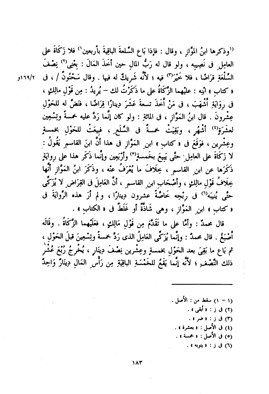 وذكرها ابن الْمَوَّاز، وقال: فإذا باع السلعة الباقية بأربعين فلا زكاة على العامل في نصيبه، ولو قال له ربُّ المال حين أخذ المالَ: بعنِي نصف السلعة قراضاً. فلا خير فيه؛ لأنَّه شريكٌ له فيها. وقال سحنونُ، في "كتاب" ابنه: عليهما الزكاة على ما ذكرت لك – يريدُ: من قول مالكٍ، في رواية أشهبَ، فِي مَنْ أخذ تسعة عشر ديناراً قراضاً، فنضَّ له للحولِ عشرون. قال ابن الْمَوَّاز، في المائة: ولو كان إنَّمَا ردَّ عليه خمسةً وتسعين لعشرةٍ أشهرٍ، وبقيت خمسةٌ في السلعِ، فبيعت للحولِ بخمسةٍ وعشرين، فوقعَ في "كتاب" ابن الْمَوَّاز في هذا أنَّ ابنَ القاسمِ يقول: