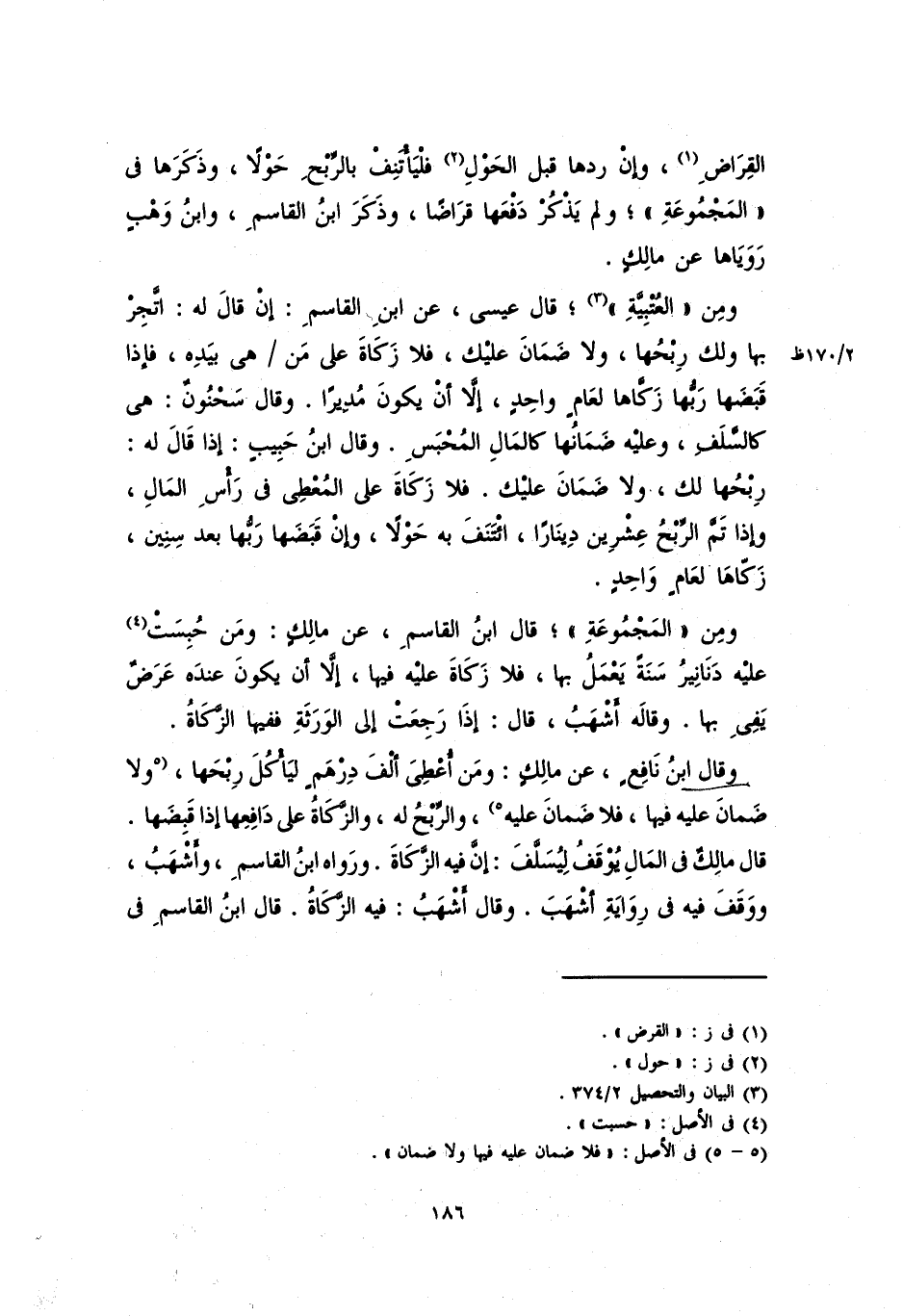 ومن "العُتْبِيَّة"، قال عيسى، عن ابن القاسمِ: إنْ قال له: اتَّجِرْ بها ولك ربحها، ولا ضمان عليك، فلا زكاة على مَن هي بيده، فإذا قبضها ربُّها زكاها لعامٍ واحدٍ، إلاَّ أنْ يكون مديراً. وقال سحنون: هي كالسلفِ، وعليه ضمانها كالمال المحبسِ، وقال ابن حبيبٍ: إذا قال له: ربحها لك، ولا ضمان عليك. فلا زكاة على المعطي في رأس المالِ، وإذا تمَّ الربح عشرين ديناراً، ائتنف به حولاً، وإن قبضها ربُّها بعد سنينَ، زكَّاها لعامٍ واحدٍ.