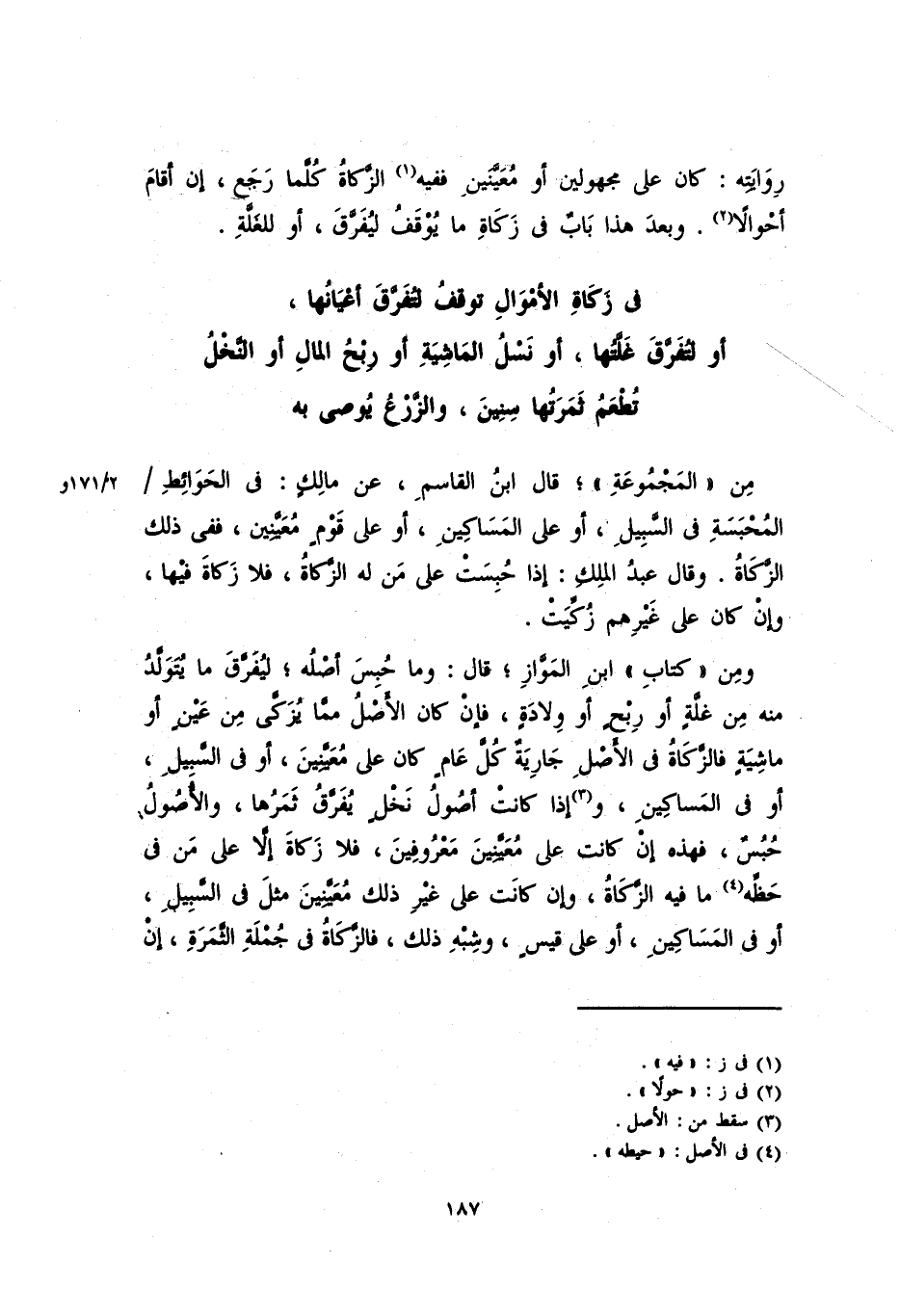 ومن "كتاب" ابن الْمَوَّاز؛ قال: وما حُبِسَ أصله، ليفرقَ ما يتولد منه من غلَّةٍ أو ربحٍ أو ولادةٍ، فإنْ كان الصل ممَّا يزكي من عين أو ماشيةٍ فالزكاة في الأصل جاريةٌ كل عامٍ كان على معينين، أو في السبيلِ، أو في المساكين، وإذا كانت أصول نخلٍ يُفرَّقُ ثمرتها، والأصول حُبُسٌ، إن كانت على معينين معروفين، فلا زكاة إلاَّ على مَن في حَظِّهِ، ما فيه الزكاةُ، وإذْ كانت على غير معينين مثل في السبيلِ، أو في المساكين، أو على قيسٍ، وشبه ذلك، فالزكاة في جملة الثمرة، إنْ