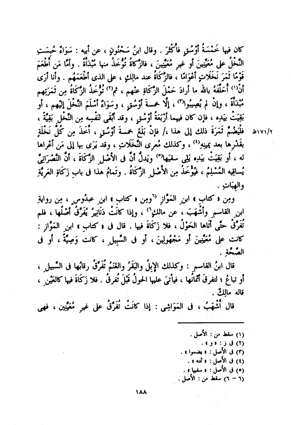 كان فيها خمسةُ أوسقٍ فأكثر. وقال ابن سحنونٍ، عن أبيه: سَوَاءٌ حُبِسَتِ النخلُ على معينين أو غير معينين، فالزكاة تؤخذُ منها مبدَأةً. وأمَّا من أطعمَ قوماً ثمرَ نخلاتٍ أعواماً، فالزكاة عند مالكٍ، على الذي أطعمهم. وأنا أرى أنْ أُحَلِّفَهُ بالله ما أراد حملَ الزكاة عنهم، ثم تؤخذ الزكاة من ثمرتهم مبدأةً، وإن لم يصيبوا، إلا خمسة أوسقٍ، وسواء اسلم النخلَ إليهم، أو بقيت بيدهِ، فإنْ كان فيهما أربعة اوسقٍ، وقد بقي لنفسهِ من النخلِ بقيَّةً، فليضمَّ ثمرة ذلك على هذا، فإنْ بلغ خمسة أوسقٍ، أخذ من كل نخلةٍ بقدرها بعد يمينه، وكذلك مُعرِي النخلاتِ، وقد يرى بها على مَن أعراها له، أو بقيت بيده يلي سقيها ويدلُّ أنَّ في الأصلِ الزكاةَ، أنَّ النصرانيَّ يُساقيه المسلمُ، فيؤخذ من الأصلِ الزكاةُ. وتمامُ هذا في باب زكاةِ العريَّةِ والهباتِ.