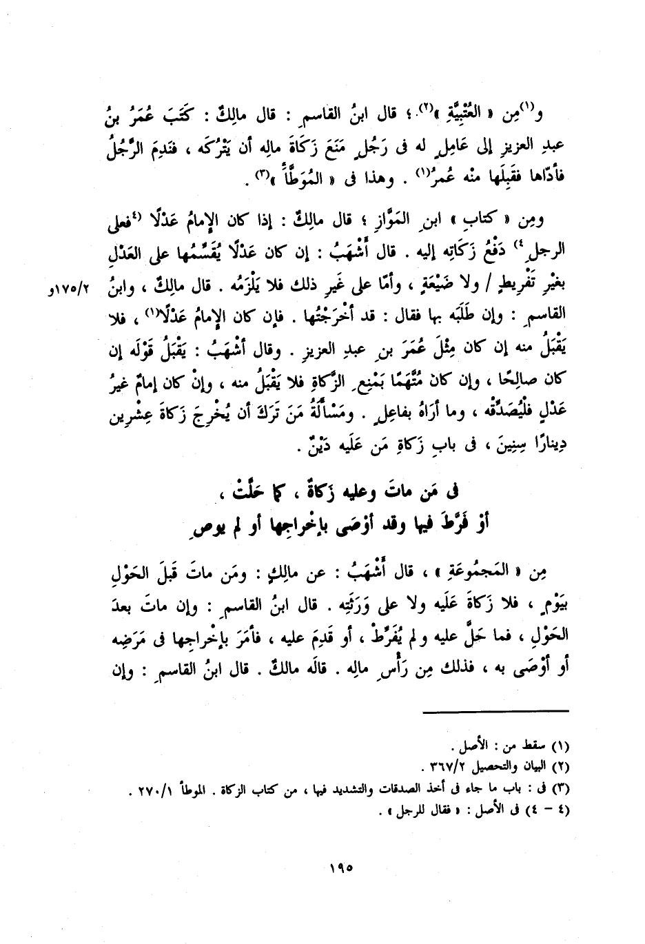 من "المَجْمُوعَة"، قال أشهبُ: عن مالكٍ: ومَن مات قبل الحولِ بيومٍ، فلا زكاة عليه ولا على ورثته، قال ابن القاسمِ: وإنْ مات بعدَ الحولِ، فما حلَّ عليه ولم يُفرِّطْ، أو قدمَ عليه، فأمر بإخراجها في مرضهِ أو أوصى به، فذلك من رأس ماله. قاله مالكٌ: قال ابن القاسمِ: وإنْ