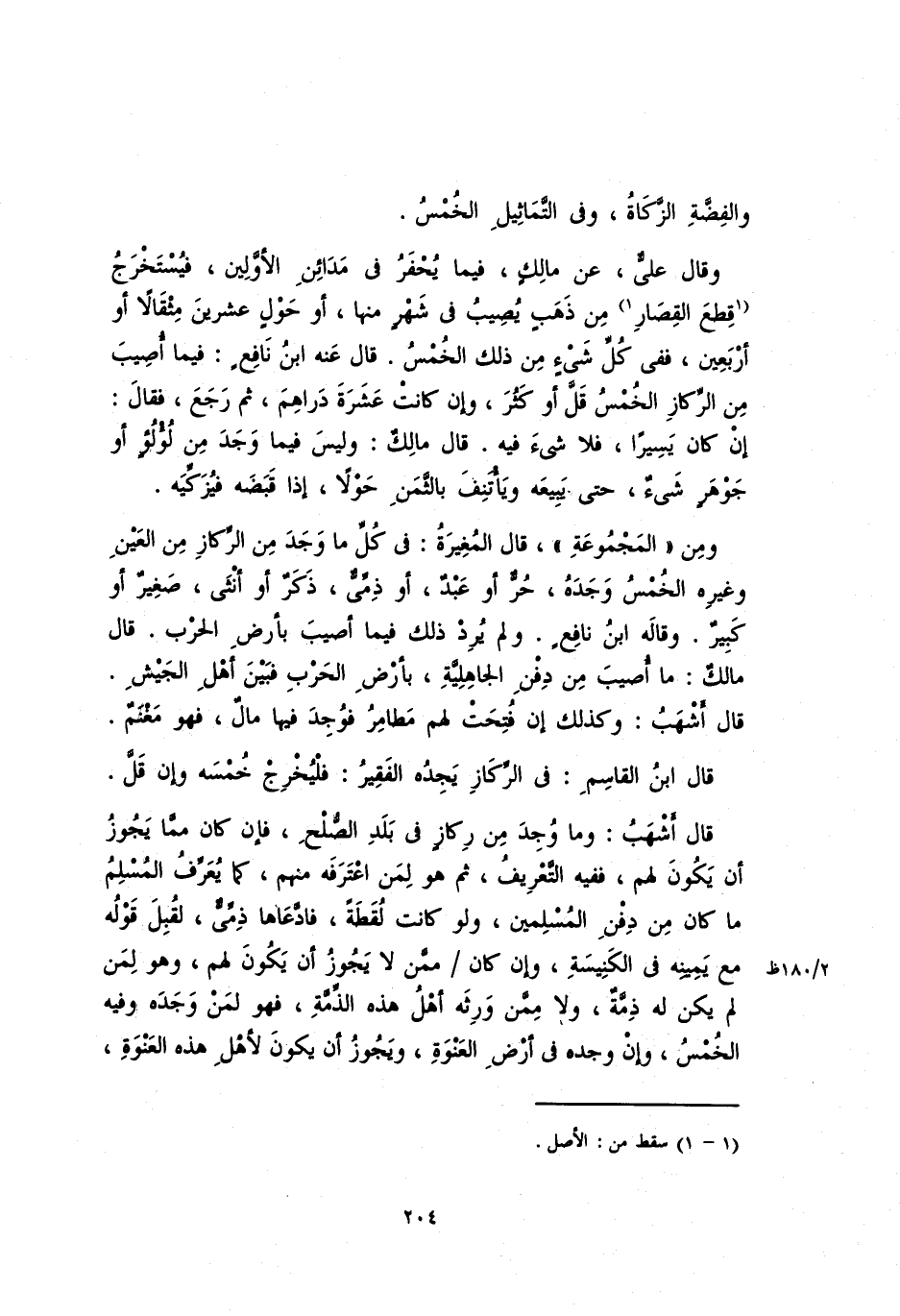وقال عليٌّ، عن مالكٍ، فيما يحفر في مدائن الأولين، فيستخرج قِطعَ القصَارِ من ذهبٍ يصيب في شهرٍ منها، أو حولٍ عشرين مثقالاً أو أربعين، ففي كل شيءٍ من ذلك الخمس، قال عنه ابن نافعٍ: فيما أصيب من الركازِ الخمسُ قلَّ أو كثر. وإن كانت عشرة دراهم، ثم رجع، فقاتل: إنْ كان يسيراً، فلا شيء فيه. قال مالكٌ: وليس فيما وجدَ من لؤلؤٍ أو جوهرٍ شيءٌ، حتى يبيعه ويأتنف بالثمنِ حولاً، إذا قبضه فيزكيه.