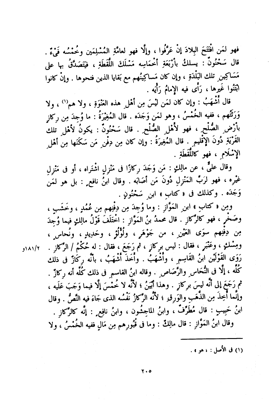 قال أشهبُ: وإن كان لمن ليس من أهل هذه العنوة، ولا همن ولا ورثتهم، ففيه الخمس، وهو لمن وجده، قال المغيرة: ما وُجدَ من ركاز بأرض الصلحِ، فهو لأهل الصلحِ. قال سحنونٌ: يكون لأهل تلك القريةِ جون الإقليم. قال المغيرة: وإن كان من دفن مَن سكنها من أهل الإسلام، فهو كاللقطة.