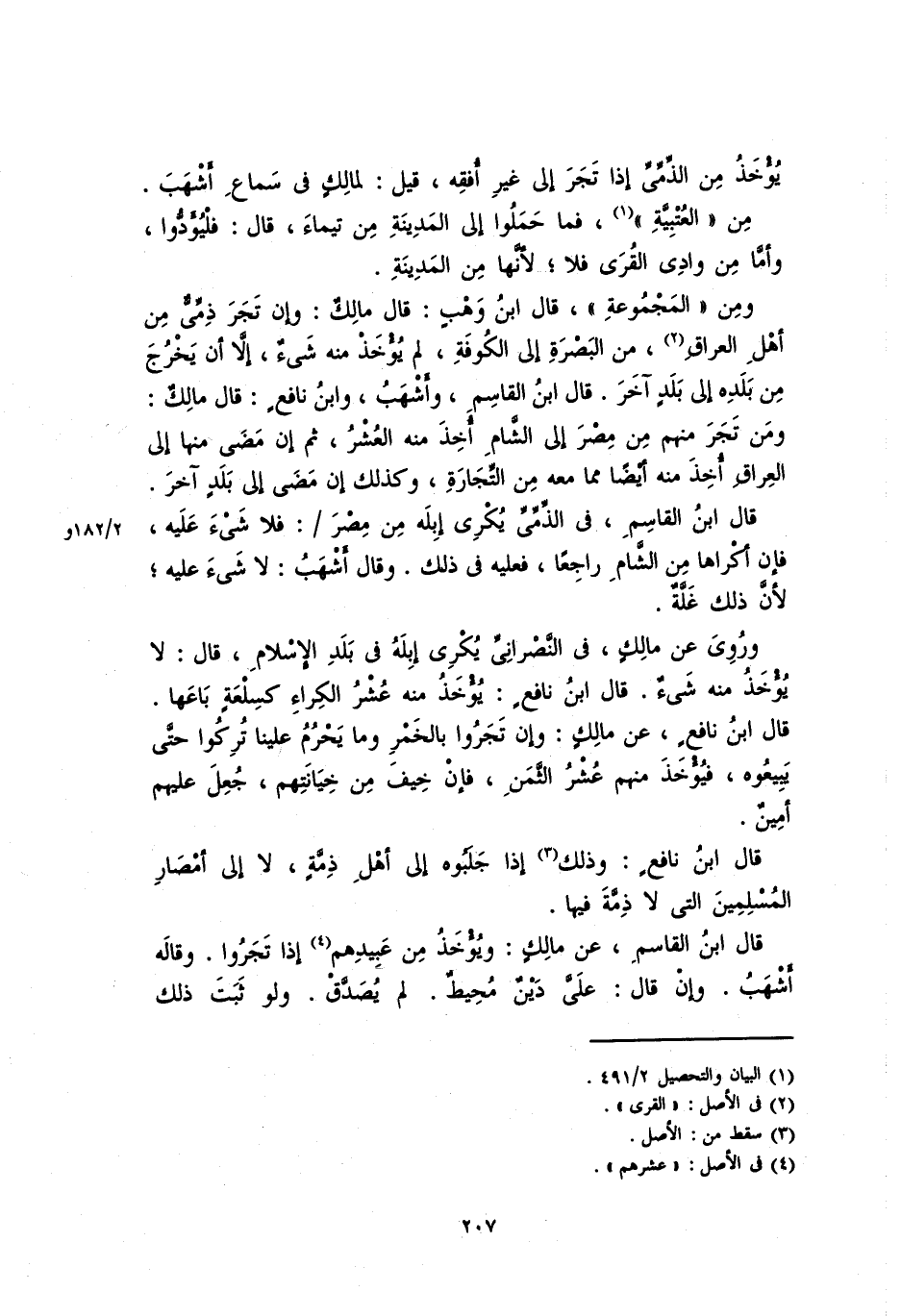 ومن "المَجْمُوعَة"، قال ابن وهبٍ: قال مالكٌ: وإن تجرَ ذمِّيٌّ من أهل العراقِ، من البصرةِ على الكوفةِ، ولم يؤخذ منه شيءٌ، إلا أَنْ يخرج من بلده على بلد آخر. قال ابن القاسمِ، وأشهبُ، وابن نافعٍ: قال مالكٌ: ومَن تجرَ منهم من مصر إلى الشام أُخذ منه العشر، ثم عن مضَى منها على العراقِ أُخِذَ منه أيضا مما معه من التجارة، وكذلك إنْ مضَى على بلدٍ آخر.