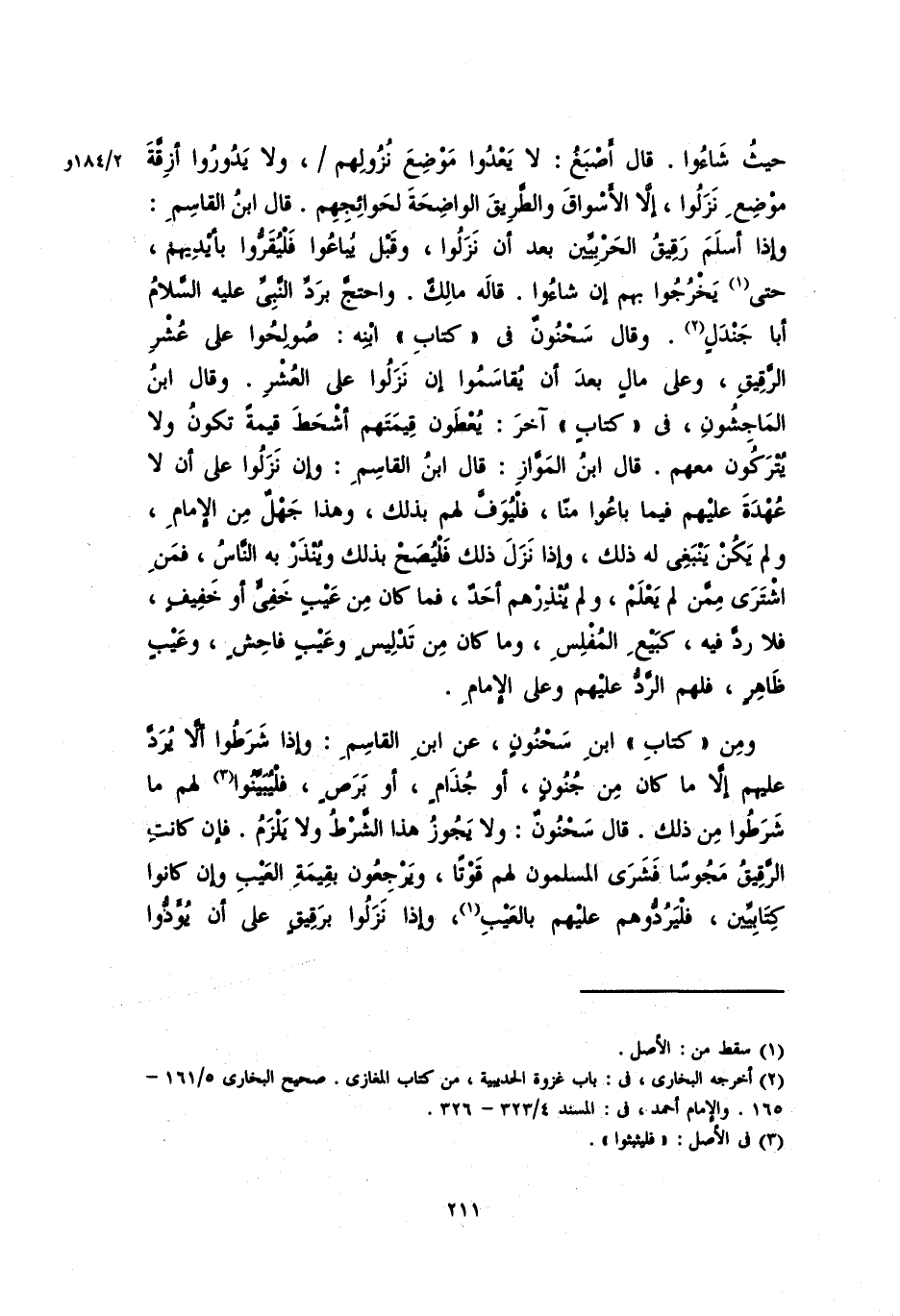 حيث شاءوا. قال أصبغُ: لا يعدوا موضع نزولهم، ولا يدوروا أزفة موضع نزلوا، إلا ألأسواق والطريق الواضحة لحوائجهم. قال ابن القاسمِ: وإذا أسلم رقيق الحربيين بعد أن نزلوا، وقبل يباعوا فليقرُّوا بأيديهم، حتى يخرجوا بهم عن شاءوا. قاله مالكٌ. واحتجَّ بردِّ النبي عليه السلام أبا جندلٍ. وقاله سحنونٌ في "كتاب" ابنِهِ: صُولحوا على عشر الرقيقِ، وعلى مالٍ بعد أنْ يقاسموا إن نزلوا على العشرِ. وقال ابن الماجشون، في "كتاب" آخر: يُعطون قيمتهم أشحطَ قيمةً تكونُ ولا يُتركون معهم. قال ابن الْمَوَّاز: قال ابن القاسمِ: وإن نزلوا على أن لا عهدةَ عليهم فيما باعوا منَّا، فليُوَفِّ لهم بذلك، وهذا جهلٌ من الإمام، ولم يكن ينبغي له ذلك، وإذا نزل ذلك فليصح بذلك وينذر به الناس، فمَن اشترى ممن لم يعلم، ولم ينذرهم أحد، فما كان من عيبٍ خَفِيٍّ أو خفيف، فلا ردَّ فيه، كبيعِ المُفلسِ، وما كان من تدليسٍ وعيبٍ فاحشٍ، وعيب ظاهرٍ فلهم الردُّ عليهم وعلى ألإمام.