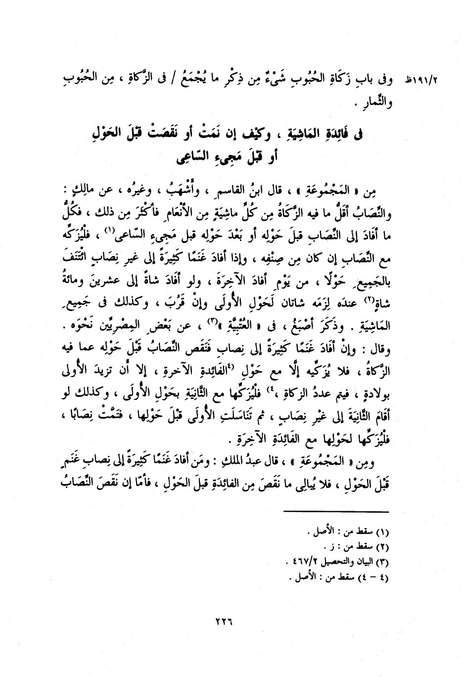 ومن "المَجْمُوعَة"، قال عبد الملكِ: ومَن أفاد غنماً كثيرةً إلى نصاب غنمٍ قبل الحولِ. فلا يُبالي ما نقص من الفائدةِ قبلَ الحولِ، فأمَّأ إن نقص النصاب