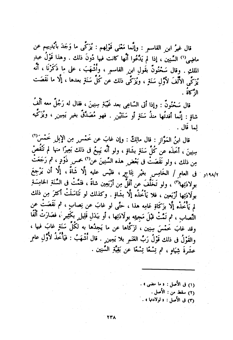 قال غيرُ ابن القاسمِ: وإنما معنى قولهم: يزكي ما وجد بأيديهم عن ماضي السنين، إذا لم يدَّعُوا أنَّها كانت فيها دون ذلك. وهذا قول عبد الملكِ. وقال سحنونٌ بقول ابن القاسمِ، وأشهب، على ما ذكرنا، أنَّه يُزكِّي الألف لأول سنةٍ، ويُزكِّي ذلك عن كل سنةٍ بعدها، إلا ما نقصت الزكاة.