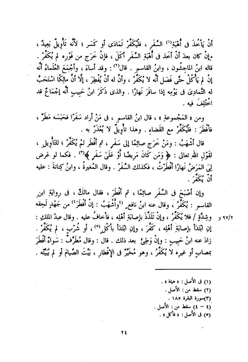 قال أشهب: ومَن خرج صائماً على سفر، ثم أفطر لم يُكفِّرْ، للتأويل، لقول الله تعالى: {وَمَنْ كَانَ مَرِيضًا أَوْ عَلَى سَفَرٍ} (¬3). فكما لو عرض ليَ المرضُ نهاراً أفْطَرْتُ، فكذلك السفر. وقال المغيرة، وابن كنانةَ: عليه أنْ يُكَفِّرَ.