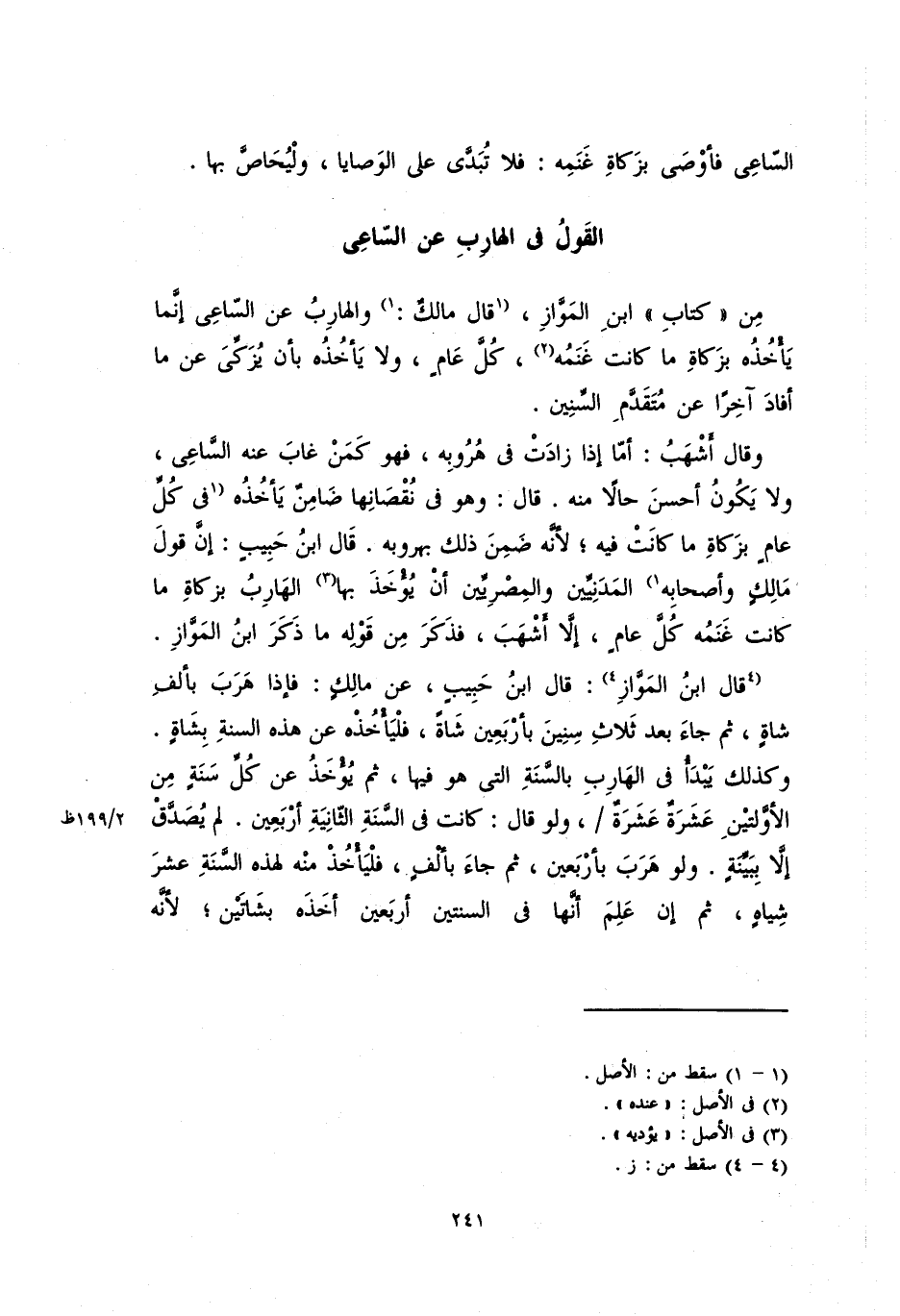 من "كتاب" ابن الْمَوَّاز، (قال مالك): والهارب عن الساعي إنَّمَا يأخذه بزكاة ما كانت غنمه كل عامٍ، ولا يأخذه بأن يزكِّيَ عن ما أفاد آخراً عن متقدم السنين.