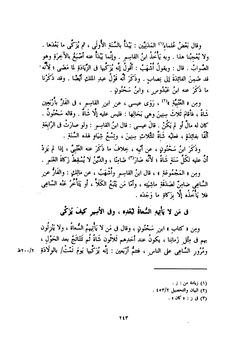 وذكر ابن سحنونٍ، عن أبيه، خلافَ ما ذكر عنه العتبيِّ، إذا لم يزد أنَّ عليه لكل سنةٍ شاةً؛ لأنَّه صار ضامناً، والدين لا يُسقِطُ زكاةَ الغنمِ.