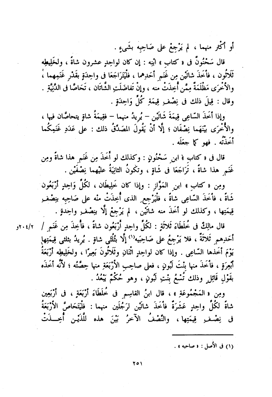 قال سحنونٌ في "كتاب" ابنه: إن كان لواحدٍ عشرون شاةً، ولخليطه ثلاثون، فأخذ شاتين من غنمِ أحدهما، فليتراجعا في واحدة بقدرِ غنمهما، والأخرى مظلمة ممن أُخذت منه، وإن تفاضلت الشاتانِ، تحاصَّا في الدَّنِيَّةِ.