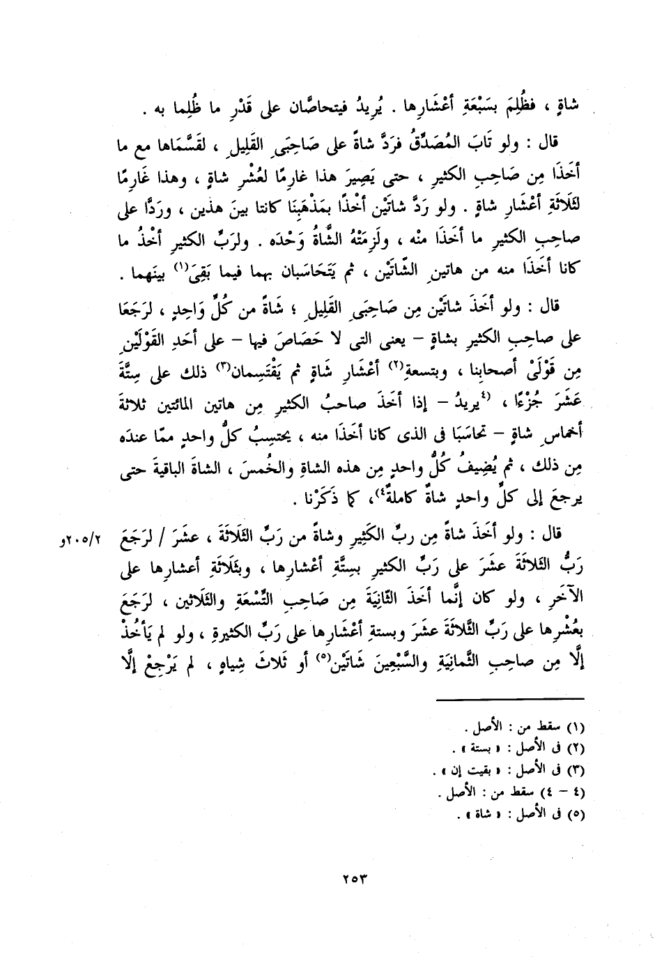 قال: ولو أخذ شاتين من صاحبي القليل، شاةً من كلِّ واحدٍ، لرجعا على صاحب الكثير بشاةٍ، يعني التي لا حصاص فيها – على أحذ القولين من قولي أصحابنا، وبتسعة أعشار شاةٍ ثم يقتسمان ذلك على ستة عشر جزءاً، يريدُ – إذا أخذ صاحبُ الكثيرِ من هاتين المائتين ثلاثة أخماس شاةٍ – تحاسبا في الذي كانا أخذا منه، يحتسب كل واحدٍ ممَّا عندَه من ذلك، ثم يضيف كل واحدٍ من هذه الشاة والخمس، الشاة الباقية حتى يرجع إلى كلِّ واحدٍ شاةٌ كاملةٌ، كما ذكرنا.
