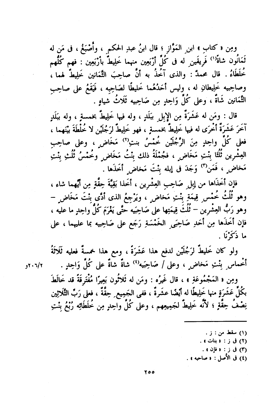 قال: ومن له عشرةٌ من الإبلِ ببلدٍ، وله فيها خليطٌ بخمسةٍ، وله ببلدٍ آخر عشرةٌ أخرى له فيها خليط بخمسةٍ، فهو خليط لرجلين لا خُلطةَ بينهما، فعلى كلِّ واحدٍ من الرجلين خمسُ بنتِ مَخاضٍ، وعلى صاحبِ العشرين ثلثا بنت مخاضٍ، فجملة ذلك بنت مخاضٍ وخُمسُ ثلث بنت مَخاضٍ، فمن وجدَ في إبله بنت مخاضٍ أخذها.