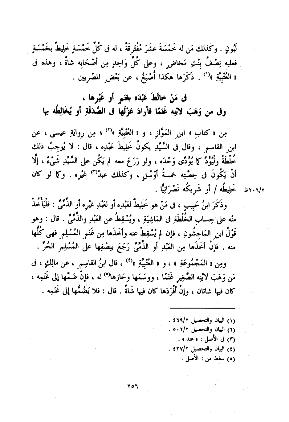 وذكر ابن حبيبٍ فِي مَنْ هو خليطٌ لعبدهِ أو لعبدِ غيره أو الذمِّيِّ: فليأخذ منه على حساب الخُلطةِ في الماشية، ويُسقِطُ عن العبدِ والذمي. قال: وهو قول ابن الماجشون، فإن لم يُسقط عنه وأخذها من غنمِ المسلمِ فهي كلها منه. فإن أخذها من العبدِ أو الذمي رجعَ بنصفها على المسلمِ الحرِّ.