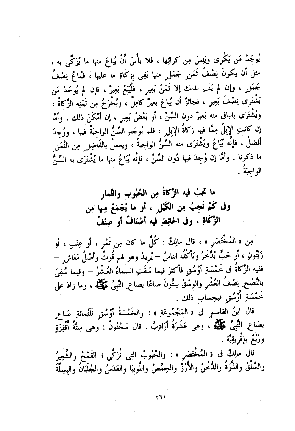 من "المختصر" قال مالكٌ: كلُّ ما كان من تمرٍ، أو عنبٍ، أو زيتونٍ، أو حَبٍّ يُدَّخَرُ ويأكله الناس – يريدُ وهو لهم قوتٌ وأصلُ معاشٍ – ففيه الزكاةُ في خمسةِ أوسقٍ فأكثر فيما سقتِ السماء العشرُ – وفيما سُقِيَ بالنَّضْحِ نصف العشرِ والوسْقُ ستون صاعاً بصاع النبي صلى الله عليه وسلم وما زاد على خمسة أوسقِ فبحسابِ ذلك.