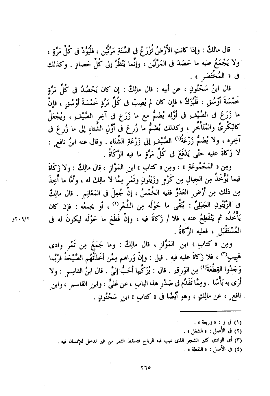 قال ابن سحنونٍ، عن أبيه: قال مالكٌ: إن كان يحصد في كلِّ مرةٍ خمسة أوسقٍ، فليزكِّ، فإن لم يُصِبْ في كل مرةٍ خمسة أوسقٍ، فإنَّ ما زرع في الصيفِ في أوله يُضَمُّ مع ما زرع في آخر الصيف، ويُجعلُ كالبَكْرِيِّ والمتأخر، وكذلك يضم ما زرع في أول الشتاء إلى ما زرع في آخره، ولا يُضمُّ زرعة الصيف إلى زرعة الشتاء، وقال عنه ابن نافعٍ: لا زكاة عليه حتى يدفع في كل مرةٍ ما فيه الزكاة.