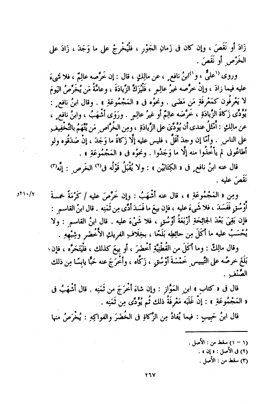 ورَوَى عليٌّ وابن نافعٍ، عن مالكٍ، قال: إن خرَّصه عالمٌ، فلا شيء عليه فيما زاد، وإن خرَّصَه غيرُ عالمٍ، فليُزكِّ الزيادة، وعامة من يخرِّصُ اليومَ لا يعرفون كمعرفة من مضى. ونحوُه في "المَجْمُوعَة". وقال ابن نافعٍ: يؤدي زكاة الزيادة، خرَّصَه عالم أو غير عالمٍ. ورَوَى أشهبُ، وابن نافعٍ، عن مالكٍ: أمْثَلُ عندي أَنْ يؤدي على الزيادة، ومن الخُرَّاصُ مَن يُتَّهَمُ بالتخفيف على الناسِ. وأما من وجد أقلَّ. فليس عليه إلا زكاة ما وجد، إنْ صَدَقُوه ولو أطاعوني لم يأخذوا منه إلا ما وجدوا. ونحوُه في "المَجْمُوعَة".