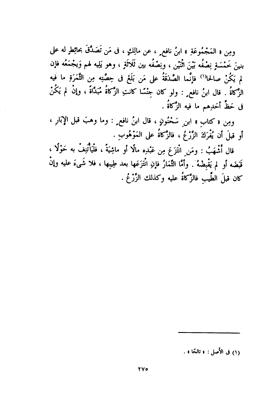 ومن "المَجْمُوعَة"، ابن نافعٍ، عن مالكٍ، فِي مَنْ تصدَّقَ بحائطٍ له على بنين خمسةٍ نصفه بين اثنين، ونصفه بين ثلاثةٍ، وهو يليه لهم ويجمعه فإن لم يكن صالحاً فإنَّمَا الصدقةُ على مَن بلغ في حصتهِ من الثمرةِ ما فيه الزكاةُ. قال ابن نافعٍ: ولو كان جنساً كانتِ الزكاةُ مُبَدَّاةً، وإن لم يكن في حظِّ أحدهم ما فيه الزكاةُ.