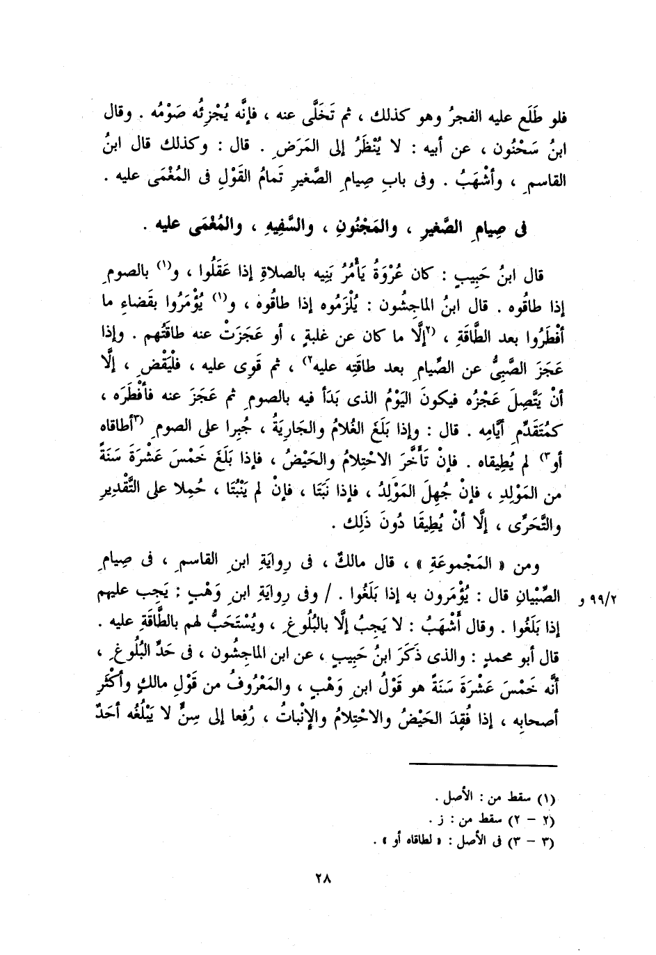 ومن "المَجْمُوعَة"، قال مالك، في رواية ابن القاسم، في صيام الصبيان قال: يؤمرون به إذا بلغوا. وفي رواية ابن وهب: يجب عليهم إذا بلغوا. وقال أشهب: لا يجب إلا البلوغ، ويستحب لهم بالطاقة عليه.