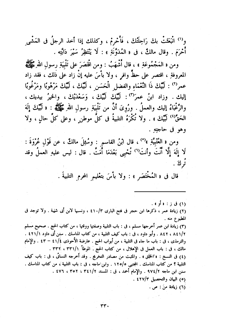 ومن "المَجْمُوعَة"، قال أشهبُ: ومن اقتصر على تلبية رسول الله صلى الله عليه وسلم المعروفة، اقتصر على حظٍّ وافرٍ، وَلا بَأْسَ عليه إن زاد على ذلك، فقد زاد عمر: لبَّيْكَ ذا النَّعماءِ والفضلِ الحسنِ، لبيك، لبيك مرهوباً ومرغوباً إليك. وزاد ابنُ عمرَ: لبيك ليك، وسعديك، والخير بيديك، والرَّغْبَاءُ إليك والعملُ.