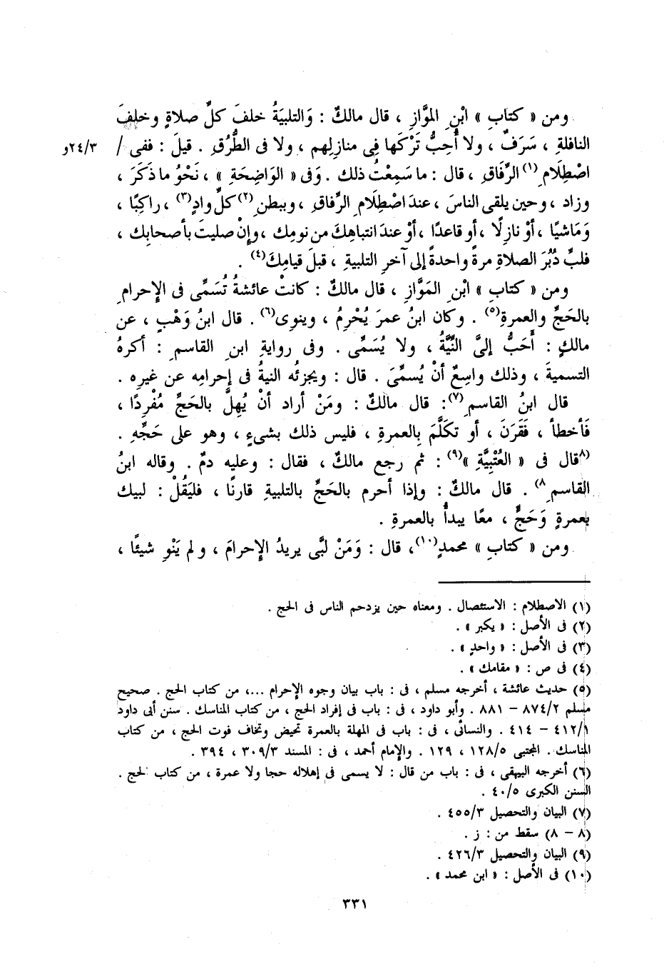 ومن "كتاب" ابن الْمَوَّاز، قال مالكٌ: والتلبية خلف كلِّ صلاةٍ وخلفَ النافلةِ، ولا أحبُّ تركها في منازلهم، ولا في الطرق. قيل: ففي اصطلام الرفاقِ، قال: ما سمعت ذلك. وفي "الواضحة"، نحو ما ذكر، وزاد، وحين يلقى الناسَ، عندَ اصطلام الرفاقِ، وببطن كل وادٍ، راكباً، وماشياً، أو نازلاً، أو قاعداً، أو عند انتباهك من نومك، وإن صليت بأصحابك، فلبِّ دبرَ الصلاةِ مرة واحدةً على آخر التلبيةِ، قبل قيامك.
