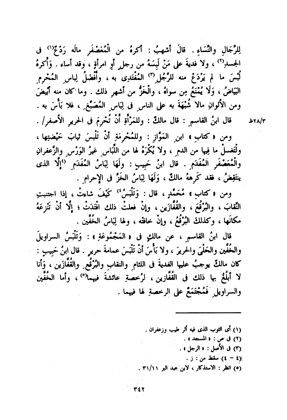 للرجال والنساءِ. قال أشهبُ: اكره من المعصفرِ مالَه رَدْعٌ في الجسدِ. ولا فدية على /َن لبسه من رجلٍ أو امرأةٍ، وقد أساء. وأكره لُبس ما لم يردع منه للرجل المفتدِي به، وأفضل لباس المحرم البياض، ولا يمنع من سواه، والخَزُّ من أشهر ذلك. وما كان منه أبيضَ ومن الألوان ما لا شبهةَ به على الناسِ في لباسِ المصبغِ، فلا بأس به.