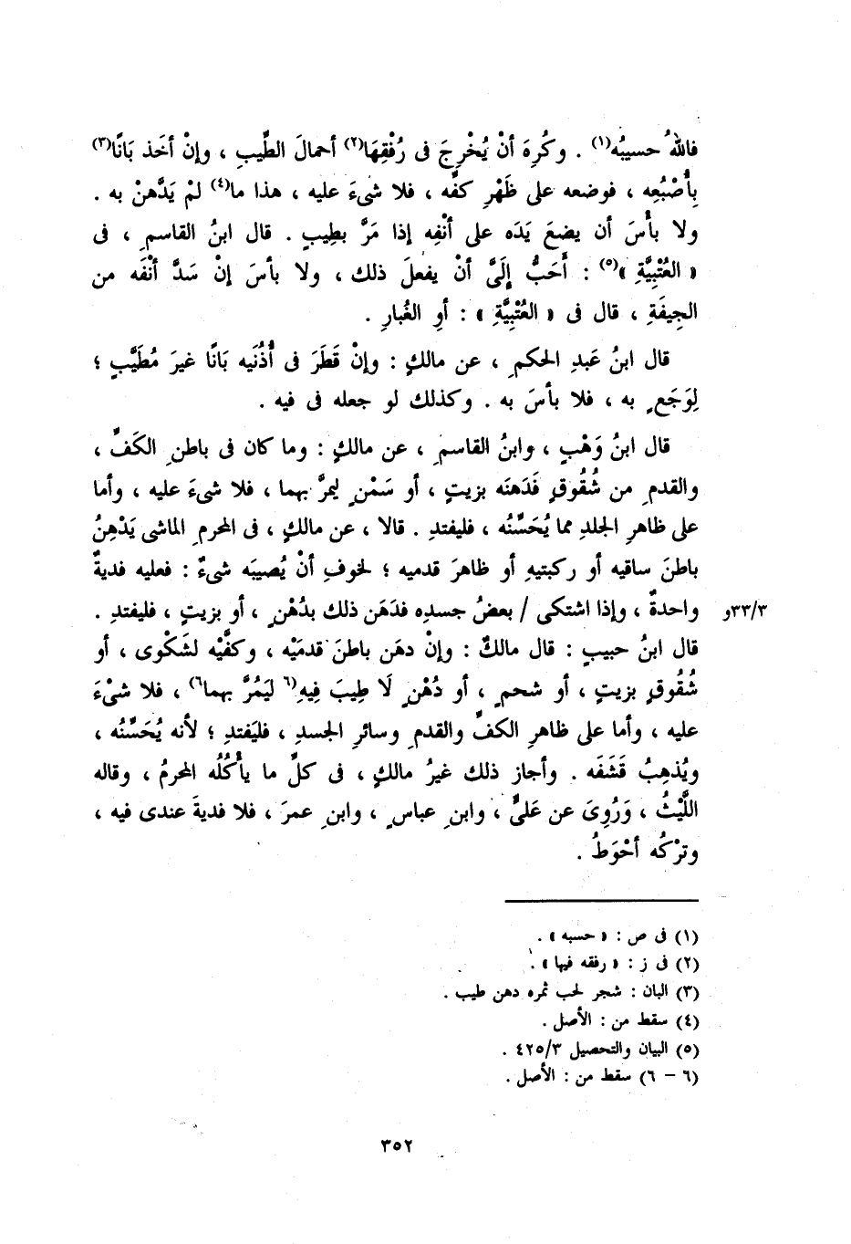 قال ابن حبيبٍ: قال مالكٌ: وإن دهن باطن قدميه، وكفيه لشكوى، أو شقوقٍ بزيتٍ، أو شحم، أو دهنٍ لا طيب فيه ليمر بهما، فلا شيء عليه، وأما على ظاهر الكفِّ والقدمِ وسائرِ الجسدِ، فليفتد، لأنَّه يُحسِّنُه، ويثذهب قشفه، وأجاز ذلك غير مالك، في كل ما يأكله المحرم، وقاله الليث، ورُوِيَ عن عليٍّ، وابن عباس، وابن عمر، فلا فدية عندي فيه، وتركه أحوطُ.