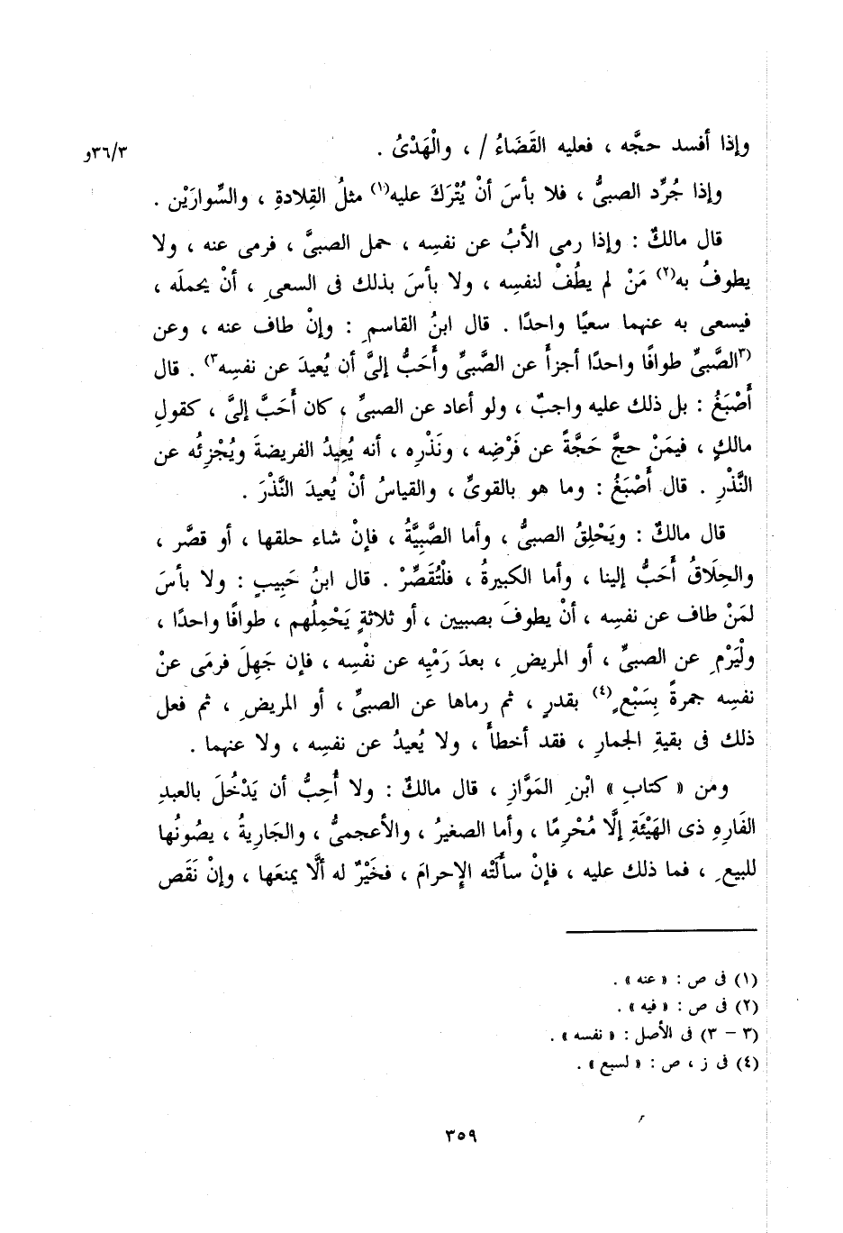 قال مالكٌ: ويَحلقُ الصبيَّ، وأمّا الصبية، فإن شاء حلقها، أو قصَّر، والحِلاقً أحب إلينا، وأما الكبيرة، فلتقصِّرْ. قال ابن حبيبٍ: وَلا بَأْسَ لمَن طاف عن نفسه، أنْ يطوف بصبيين، أو ثلاثة يحملهم، طوافاً واحداً، وليرمِ عن الصبيِّ، أو المريض، بعد رميه عن نفسهِ، فإن جهل فرمى عن نفسه جمرةً بسبعٍ بقدرٍ، ثم رماها عن الصبيِّ، أو المريضِ، ثم فعل ذلك في بقية الحمار، فقد أخطأ، ولا يُعِيد عن نفسه، ولا عنهما.