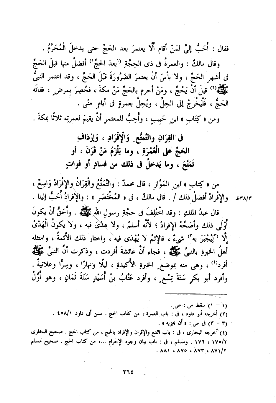 من "كتاب" ابن الموازن قال محمدٌ: والتمتع والقران والإفراد واسع، والإفراد أفضل ذلك. قال مالكٌ: في "المختصر": والإفراد أحب إلي.