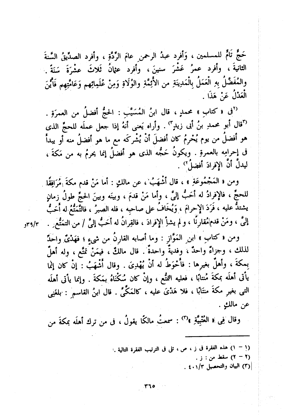 في "كتاب" محمدٍ، قال ابن المسيِّب: الحجُّ أفضلُ من العمرةِ. قال أبو محمد بن أبي زيدٍ: وأراه يعني أنه إذا جعل عملَه للحجِّ الذي هو أفضل من يوم يُحرمُ كان أفضل أن يشركه مع ما هو أفضل منه أو يبدأ في إحرامه بالعمرةِ. ويكون حَجُّه الذي هو أفضل إنما يحرم به من مكة، ليدلَّ أنَّ الإفراد أفضل.