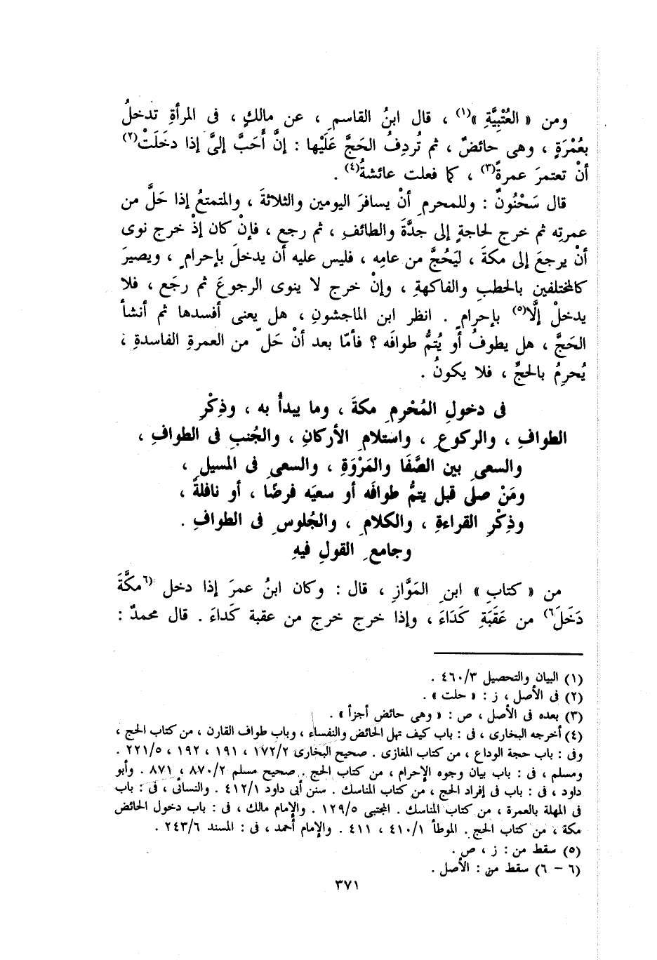 ومن "العُتْبِيَّة"، قال ابن القاسم، عن مالكٍ، في المرأة تدخل بعمرةٍ، وهي حائضٌ، ثم تردف الحج عليها: إنَّ أحبَّ إليَّ إذا دخلت، تعتمر عمرةً، كما فعلت عائشة.
