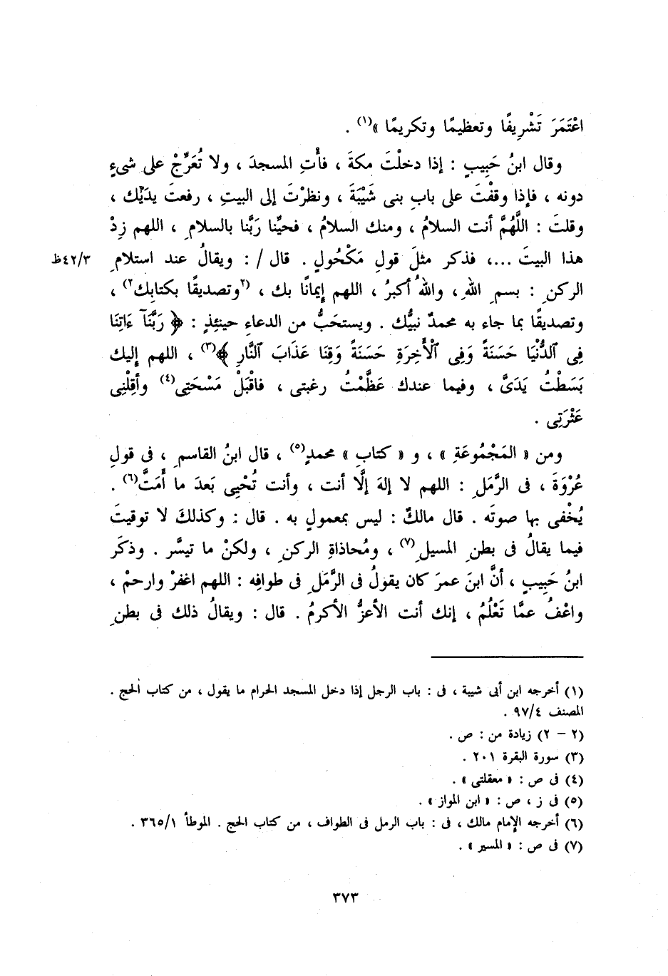 وقال ابن حبيبٍ: إذا دخلت مكةَ، فأتِ المسجدَ، ولا تُعرِّجْ على شيءٍ دونه، فإذا وقفت على باب بني شيبةَ، ونظرت إلى البيتِ، رفعت يديك، وقلتَ: اللهمَّ أنت السلام، ومنك السلام، فحيِّنا ربنا بالسلام، اللهم زِدْ هذا البيت. . . فذكر مثل قولِ مكحولٍ. قال: ويقال عند استلام الركنِ: بسم الله، والله أكبر، اللهم إيماناً بك، وتصديقاً بكتابك، وتصديقاً بما جاء به محمدٌ نبيك. ويستحبُّ من الدعاء حينئذٍ: {رَبَّنَا آَتِنَا فِي الدُّنْيَا حَسَنَةً وَفِي الْآَخِرَةِ حَسَنَةً وَقِنَا عَذَابَ النَّارِ}، اللهم إليك بسطت يدَيَّ، وفيما عندك عَظَّمْتُ رغبتي، فاقبل مسحتي وأقلني عثرتي.