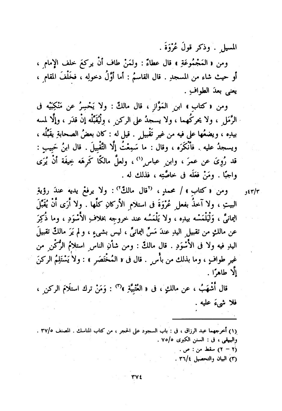 ومن "كتاب" ابن المواز، قال مالكٌ: ولا يَحسِرُ عن منكبيه في الرَّمَلِ، ولا يحركهما، ولا يسجد على الركن، وليُقَبِّلْه إن قدَر، وإلا لمسه بيده، ويضعها على ما فيه من غير تقبيلٍ. قيل له: كان بعضُ الصحابةِ يقبِّلُه، ويسجد عليه. فأنكره، وقال: ما سمعت إلا التقبيل. قال ابن حبيبٍ: قد روي عن مرَ، وابن عباسٍ، ولعل مالكاً كرهه خيفة أن يُرَى واجباً. ومَن فعله في خاصته فذلك له.