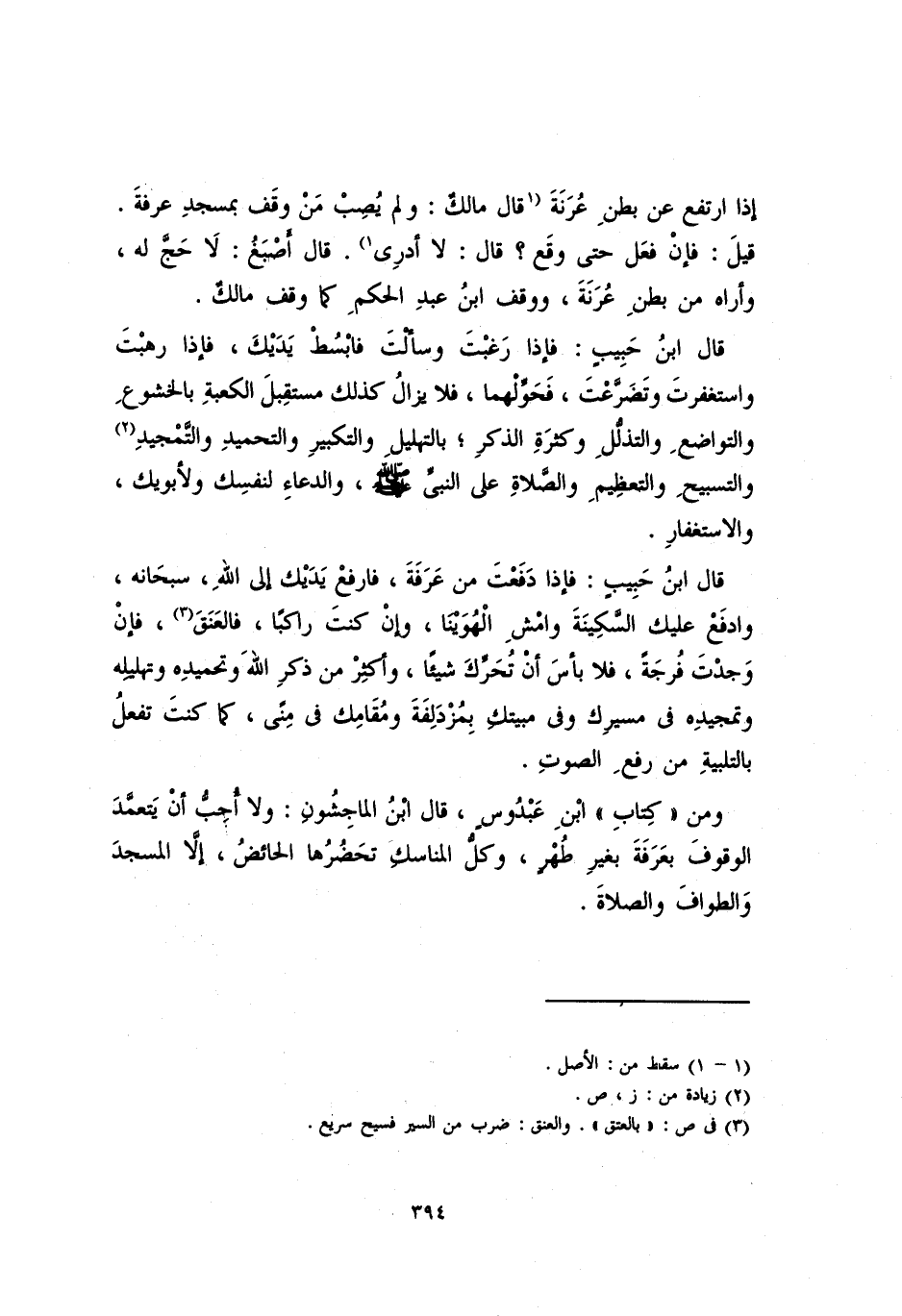 قال ابن حبيبٍ: فإذا دفعت من عرفة، فارفع يديك على الله، سبحانه، وادفع عليك السكينة وامشِ الهُوينا، وإنْ كنت راكباً، فالعنقَ، فإن وجدت فُرجةً، فلا بأس أن تحرِّكَ شيئاً، وأكثر من ذكر الله وتحميده وتهليله، وتمجيده في مسيرك وفي مبيتك بمزدلفة ومقامك في منى، كما كمنت تفعل بالتلبية من رفع الصوتِ.