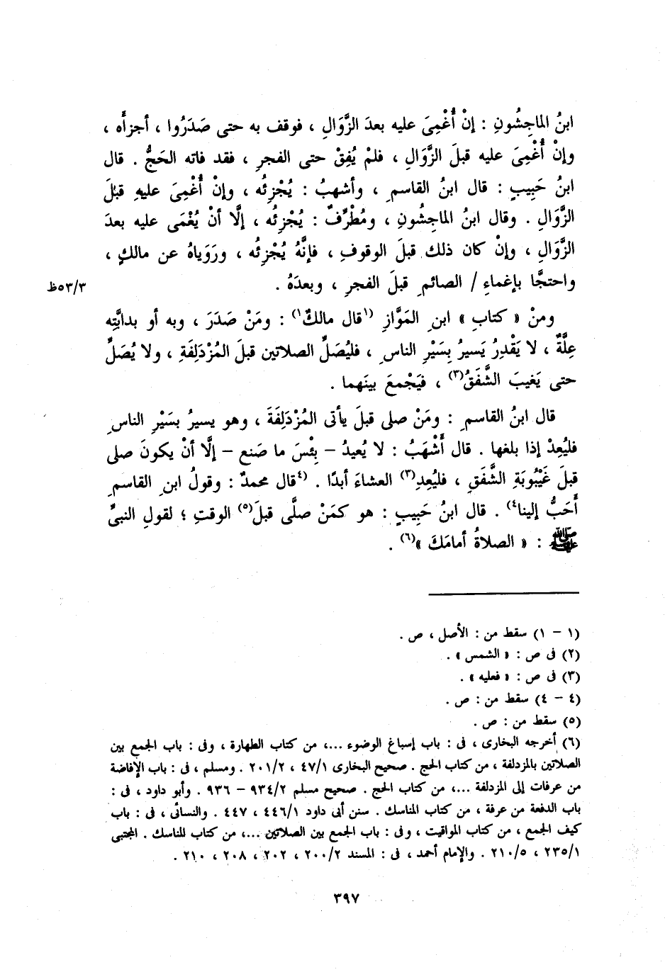 قال ابن القاسم: ومن صلَّى قبل يأتي المزدلفة، وهو يسير بسيرِ الناسِ فليُعِدْ إذا بلغها. قال أشهبُ: لا يعيد – بئس ما صنع – إلا أن يكون صلى قبل غيبوبة الشفقِ، فليعد، العشاء أبداً. قال محمدٌ: وقول ابن القاسمِ أحب إلينا. قال ابن حبيبٍ: هو كمن صلَّى قبل الوقتِ؛ لقول النبي صلى الله عليه وسلم "الصلاةُ أمامَكَ".