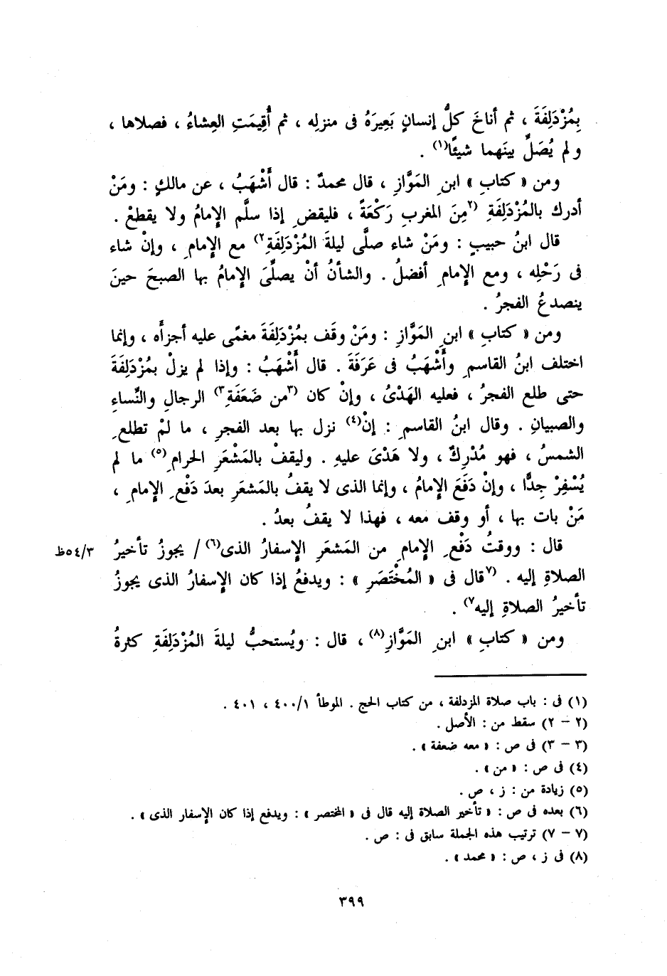 قال ابن حبيبٍ: ومن شاء صلَّى ليلة المزدلفة مع ألإمامِ، وغن شاء في رحلهِ، ومع الإمام أفضلُ. والشأن أن يصلِّيَ الإمامُ بها الصبحَ حينَ ينصدعُ الفجرُ.