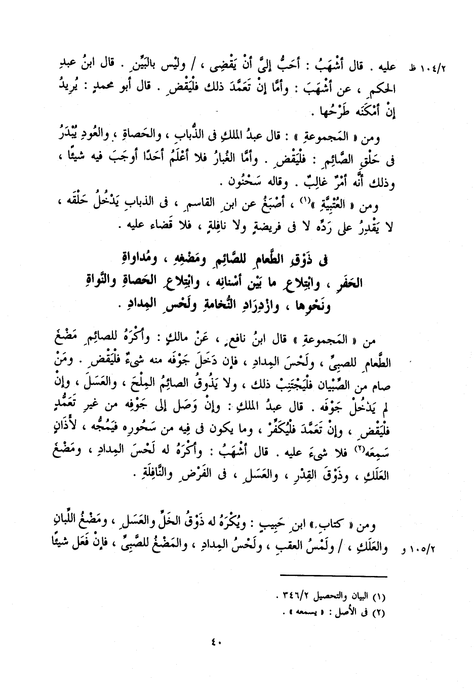 من "المَجْمُوعَة" قال ابن نافع، عن مالك: وأكره للصائم مضغ الطعام للصبي، ولحسَ المداد، فإن دخل جوفه منه شيء فليقضِ. ومَن صام من الصبيان فليجتنب ذلك، ولا يذوق الصائم المِلحَ، والعسلَ، وإنْ لم يدخل جوفه. قال عبد الملك: وإن وصل إلى جوفه من غير تعمُّدٍ فليقضِ، وإنْ تعمَّد فليُكفِّرْ، وما يكون في فِيهِ من سحوره فيَمُجُّه، لأذانٍ سَمِعَه (¬2) فلا شيء عليه. قال أشهب: وأكره له لَحْسَ المداد، ومضغ العَلكِ، وذوق القدر، والعسل، في الفرض والنافلة.