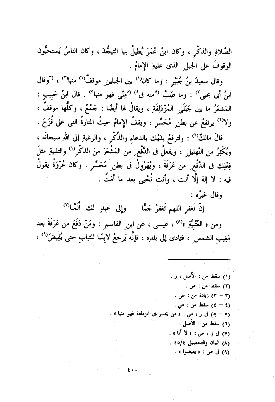 وقال سعيد بن جبيرٍ: وما كان بين الجبلين موقفٌ منها، وقال ابن أبي يحيى: وما صبَّ منه في منًى فهو منها. قال ابن حبيبٍ: المشعر ما بين جبلي المزدلفة، ويقال لها أيضا: جَمْعٌ، وكلها موقفٌ، ولا يرتفع عن بطن مُحَسِّرٍ، ويقف الإمام حيث المنارة التي على قُزَحَ.