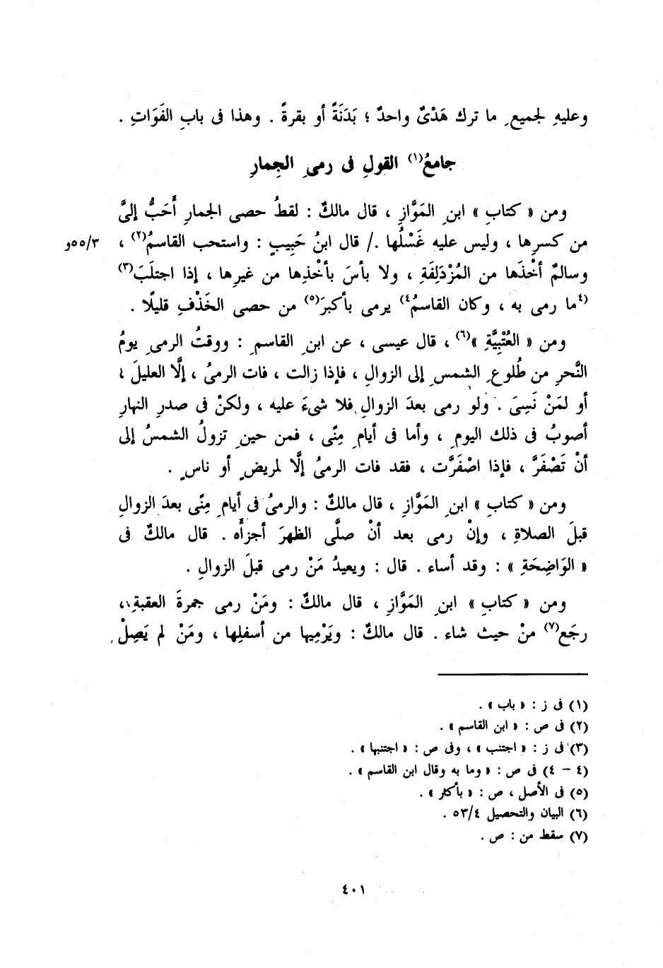ومن "العُتْبِيَّة"، قال عيسى، عن ابن القاسمِ: ووقت الرميِ يومُ النحرِ من طلوع الشمسِ إلى الزوالِ، فإذا زالت، فات الرميُ، إلا العليلَ، أو لمن نَسِيَ. ولو رمى بعد الزوال فلا شيء عليه، ولكن في صدر النهار أصوبُ في ذلك اليوم، وأما في أيام منًى، فمن حين تزول الشمس إلى أنْ تَصْفَرَّ، فإذا اصفرَّت، فقد فات الرمي إلا لمريضٍ أو ناسٍ.