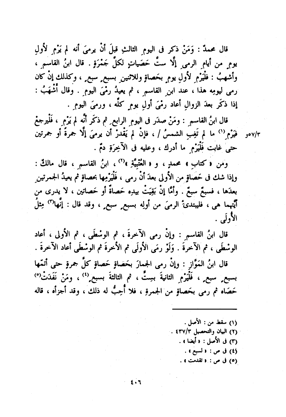 ومن "كتاب" محمدٍ، و "العُتْبِيَّة": ابن القاسم، قال مالكٌ: وإذا شكَّ في حصاة من الأولى بعد أن رمى، فليرمها بحصاة ثم يعيد الجمرتين بعدها، فسبع سبعٌ، وأما إن بقيت بيده حصاة أو حصاتين، لا يدري من أيتهما هي، فليبتدئ الرميَ من أوله بسبعٍ سبعٍ، وقد قال: إنها مثلُ الأولى.