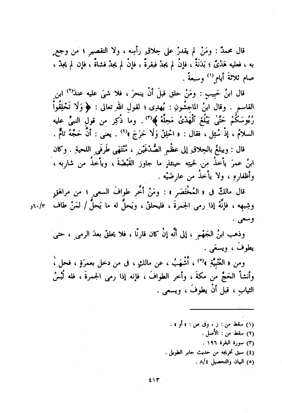 قال ابن حبيبٍ: ومَن حلق قبل أن ينحرَ، فلا شيء عليه عند ابن القاسمِ. وقال ابن الماجشون: يُهدي؛ لقول الله تعالى: {وَلَا تَحْلِقُوا رُءُوسَكُمْ حَتَّى يَبْلُغَ الْهَدْيُ مَحِلَّهُ}. وما ذُكر من قول النبي عليه السلام، إذ سُئلَ، فقال: "احْلِقْ ولا حَرَجَ". يعني: أنَّ حجَّهُ تامٌّ.