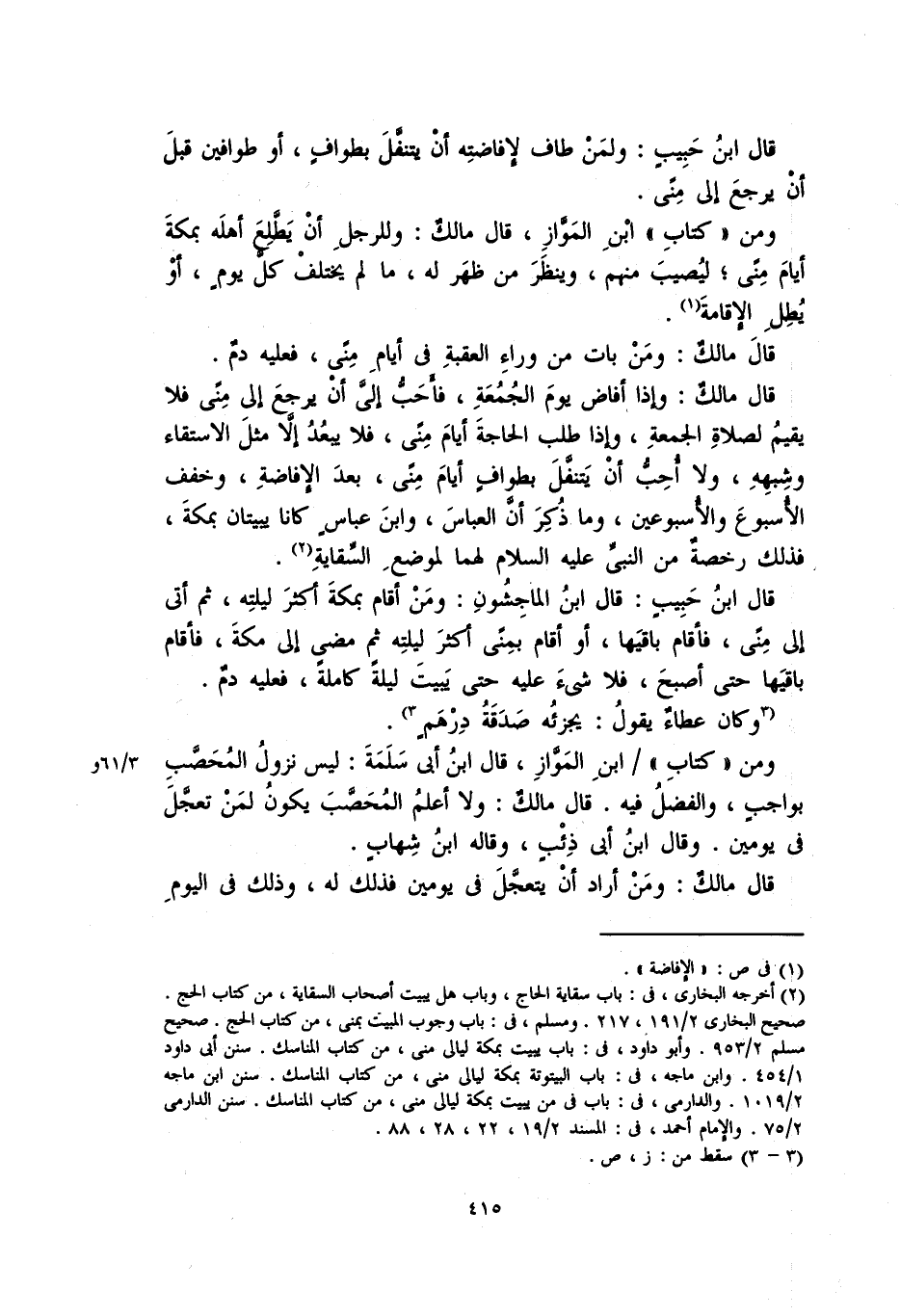 قال ابن حبيبٍ: قال ابن الماجشون: ومَن أقام بمكة أكثر ليلتهِ، ثم أتى إلى منًى، فأقام باقيها، أو أقام بمنًى أكثر ليلته ثم مضى إلى مكة، فأقام باقيها حتى أصبح، فلا شيء عليه حتى يبيت ليلةً كاملةً، فعليه دمٌ.