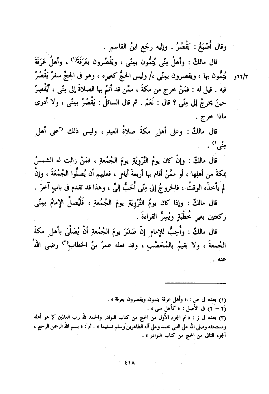 قال مالكٌ: وأهلُ منًى يُتِمُّونَ، ويقصرونَ بعرفة، وأهل عرفة يتمون بها، ويقصرون بمنًى، وليس الحج كغيره، وهو في الحجِّ سفرٌ يَقْصُرُ فيه. قيل له: فمن خرج من مكة، ممن قد أتمَّ بها الصلاة إلى منًى، أيقصر حين يخرج إلى منًى؟ قال: نعم. ثم قال السائلُ: يقصرُ بمنًى، ولا ادري ماذا خرج.