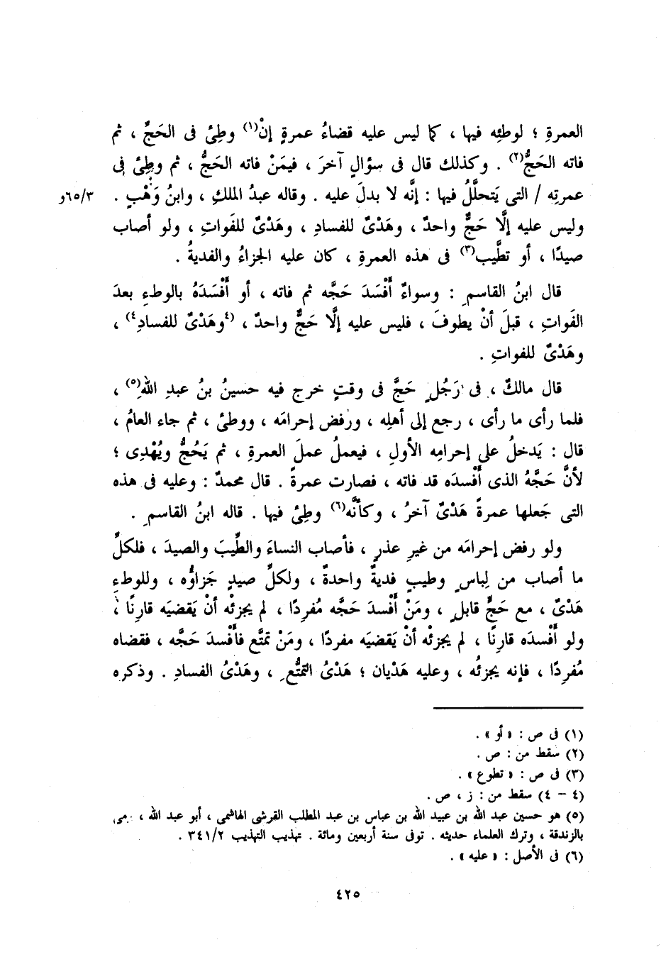 العمرةِ؛ لوطئه فيها، كما ليس عليه قضاءُ عمرةٍ إن وطئ في الحجِّ، ثم فاته الحج. وكذلك قال في سؤالٍ آخر، فيمن فاته الحج ثم وطئ في عمرته التي يتحلَّلُ فيها: إنه لا بدلَ إيه. وقاله عبدُ الملكِ، وابن وهبٍ. وليس عليه إلا حجٌّ واحدٌ، وهديٌ للفسادِ، وهديٌ للفواتِ، ولو أصاب صيداً، أو تطيب في هذه العمرة، كان عليه الجزاء والفدية.