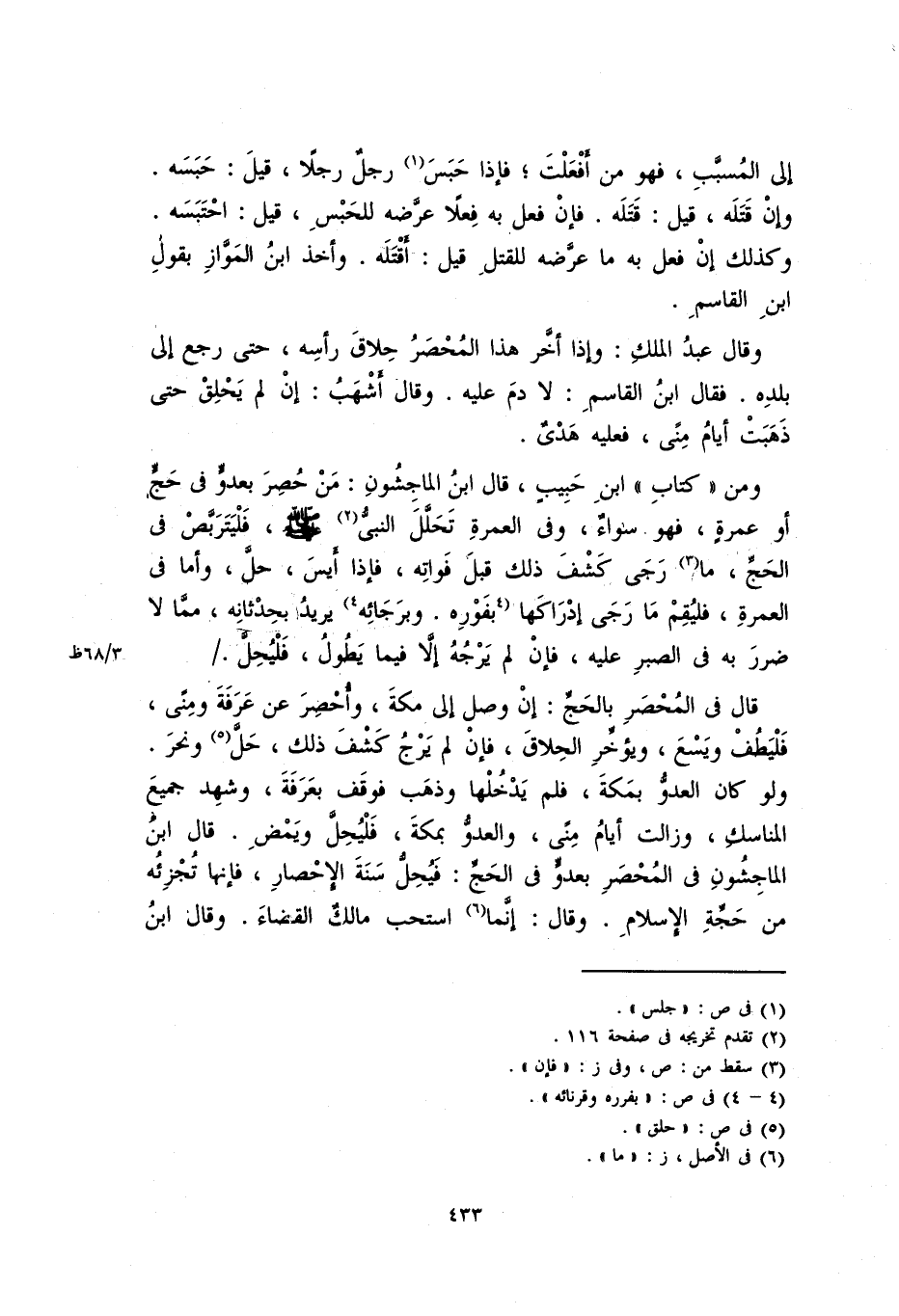 ومن "كتاب" ابن حبيبً: قال ابن الماجشون: من حَصِرَ بعدوٍّ في حجٍّ أو عمرةٍ، فهو سواءٌ، وفي العمرة تَحلَّلَ النبي صلى الله عليه وسلم، فليتربص في الحجِّ، ما رَجَى كشفَ ذلك قبل فواتهن فإذا أيسَ، حلَّ، وأما في العمرةِ، فليقم ما رجى إدراكها بفورهِ. وبرجائه يريد بحدثانه، ممَّا لا ضررَ به في الصبر عليه، فإن لم يرجه إلا فيما يطولُ، فليحل.
